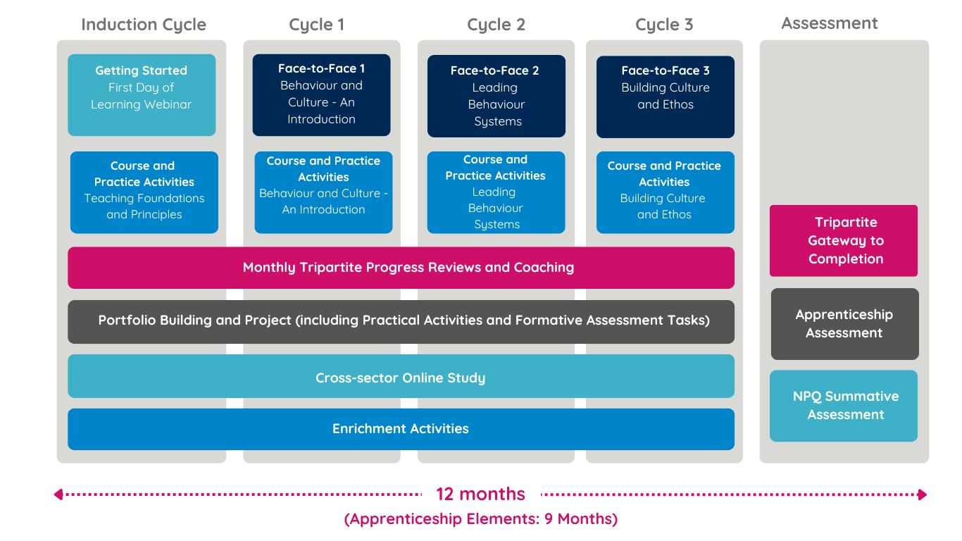 All programme elements contribute to the statutory overall compliance and engagement requirements for the practical (funded) period with the intended purpose of achieving the knowledge, skills, and behaviours (KSBs) of the apprenticeship standard, which incorporates the NPQ programme, as set by Skills England and the Department for Education (DfE). This means that all apprenticeship off-the-job training (OTJT) hours are built into the programme.