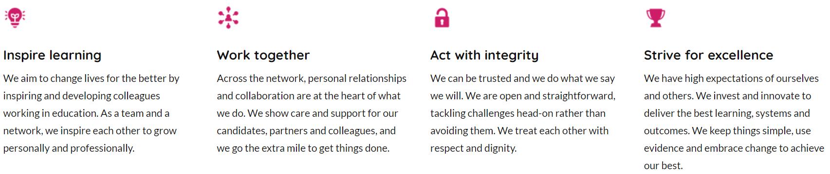 Our core values define what we stand for and how we do things, helping us to work together in the most fulfilling way to provide the best service to our learners and partners.