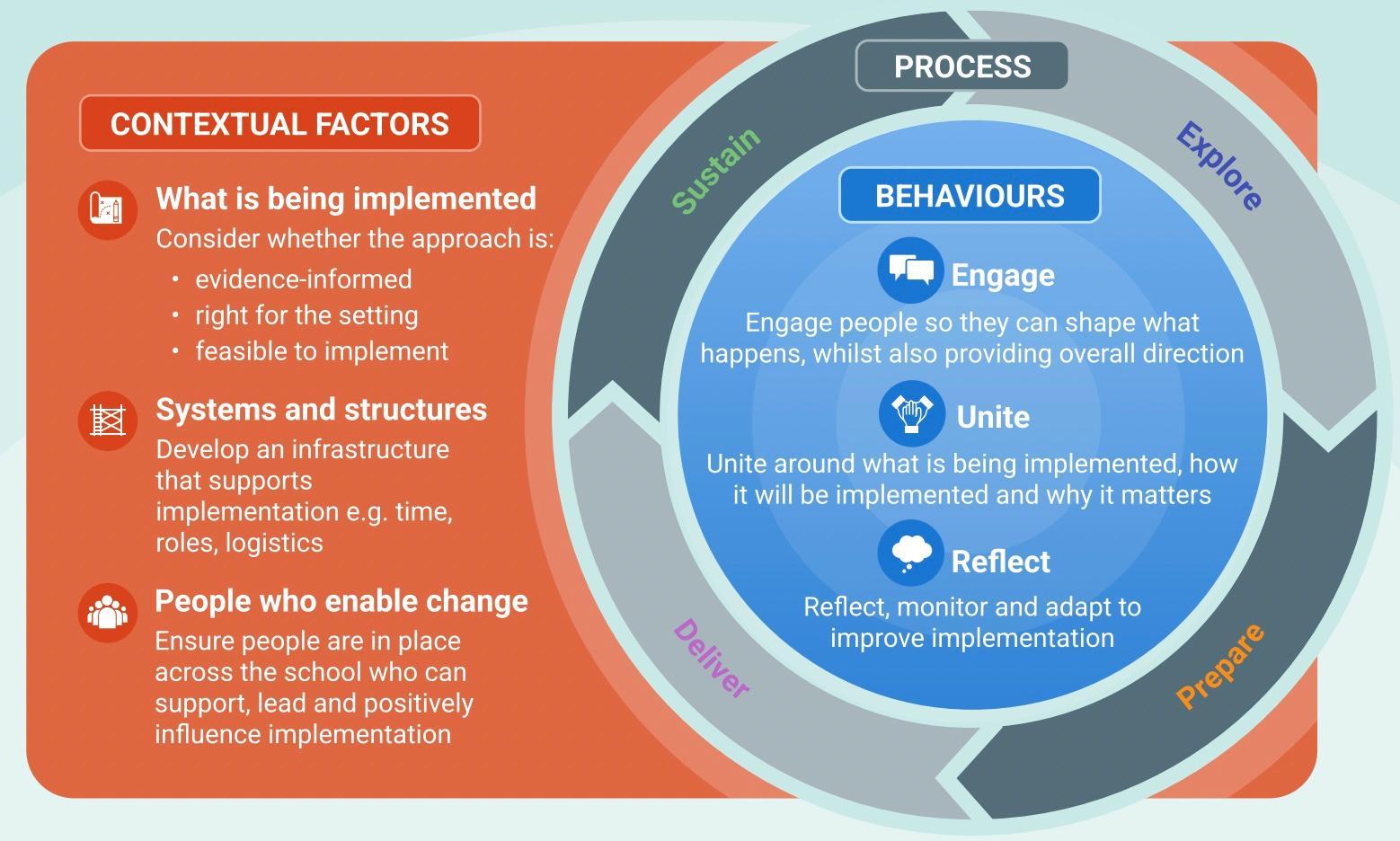 “One of the characteristics of effective schools, in addition to what they implement, is how they put those approaches into practice. [The framework statements for implementation] set out some important principles of implementation: the process of making, and acting on, effective evidenceinformed decisions. The principles and activities can be applied to a range of different school improvement decisions – programmes or practices; whole school or targeted approaches; internally or externally generated ideas. The statements should be treated as guiding principles and activities, rather than as a rigid set of steps.”