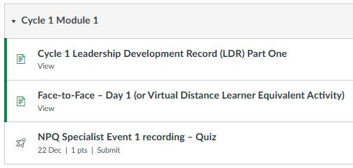 To pass the NPQ participants must engage with a minimum of 90% of the programme and pass a summative assessment task. All elements of the programmes are grouped into four engagement areas and have a % requirement designed to ensure participants meet and exceed the specifications.