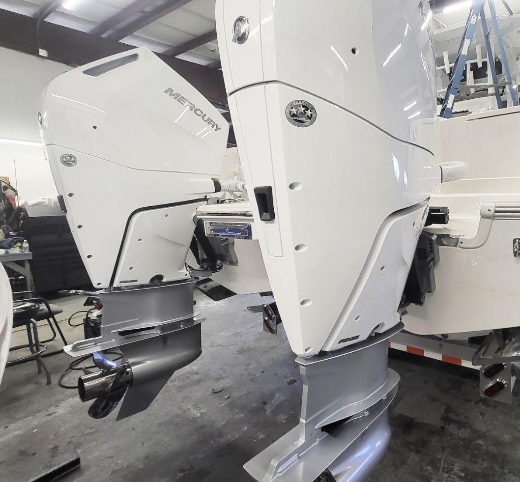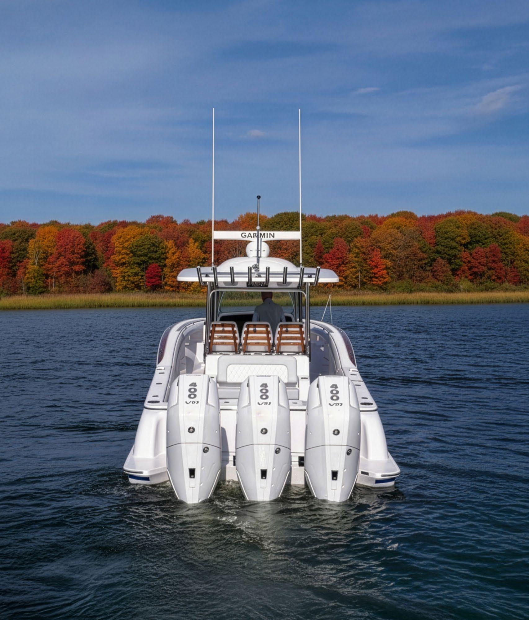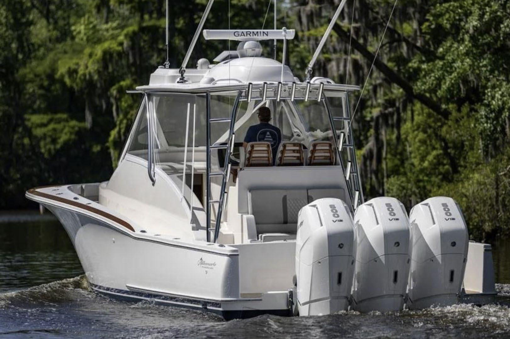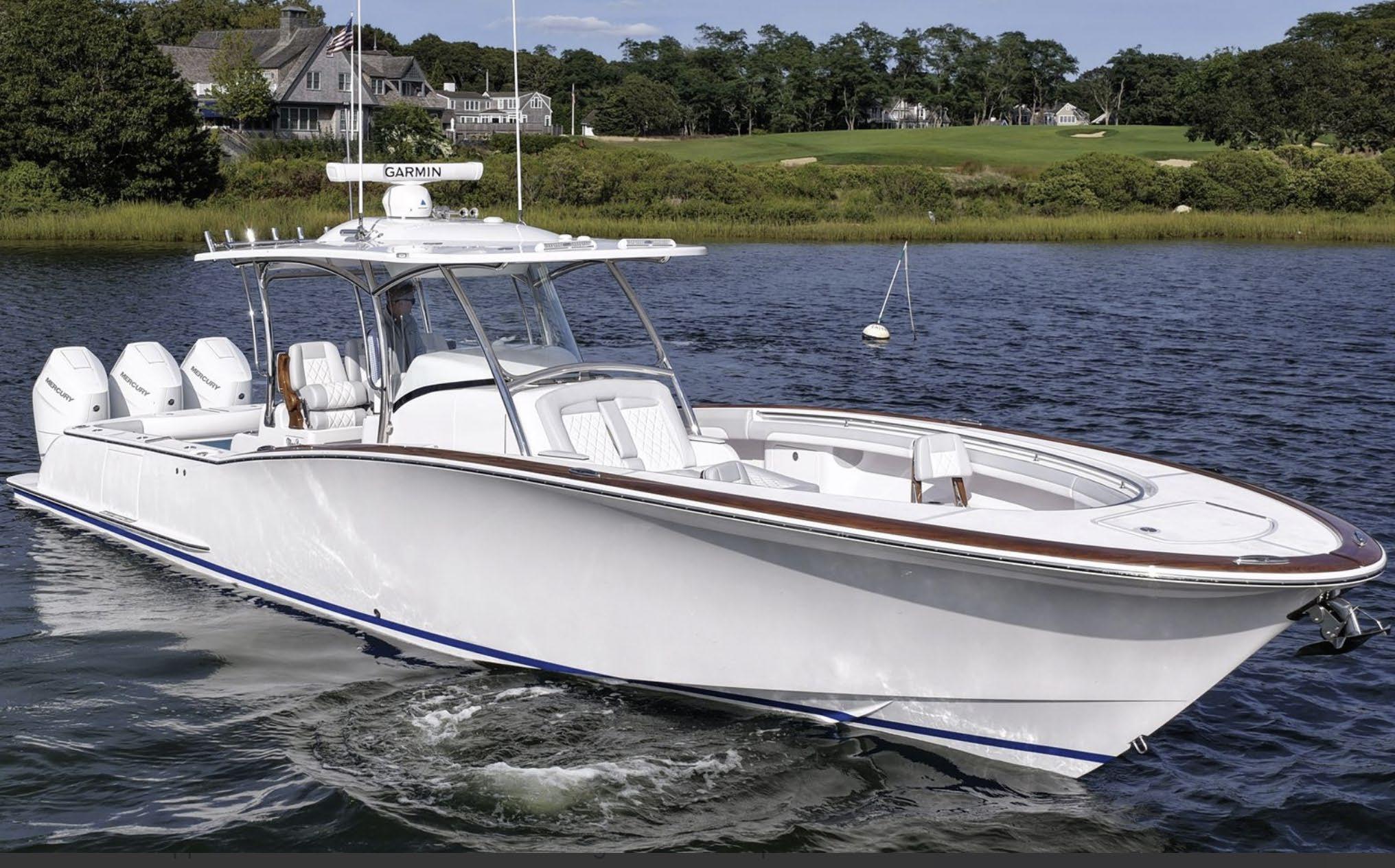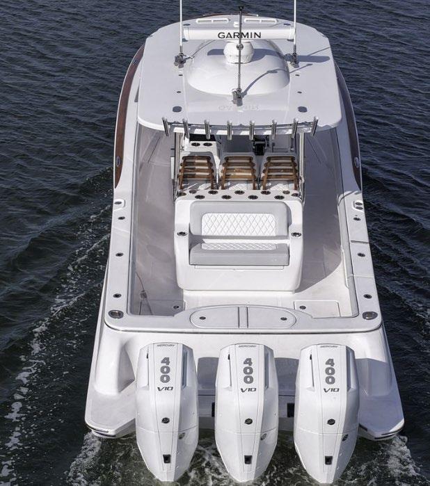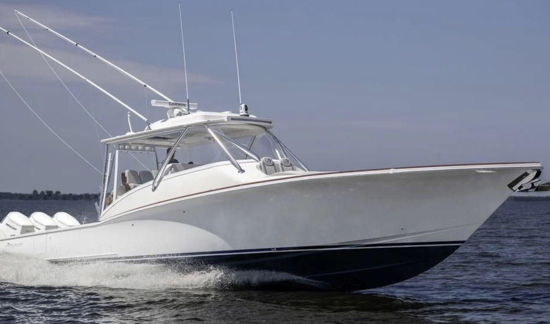 The 45 Carolinian hull has the look worthy of her name with Carolina flare, tumblehome, and a soft broken sheer. Triple 600 HP Mercury power will provide fast cruising speeds, maneuverability, and shallow draft, while freeing up space in the hull to accommodate mechanical equipment and a truly livable