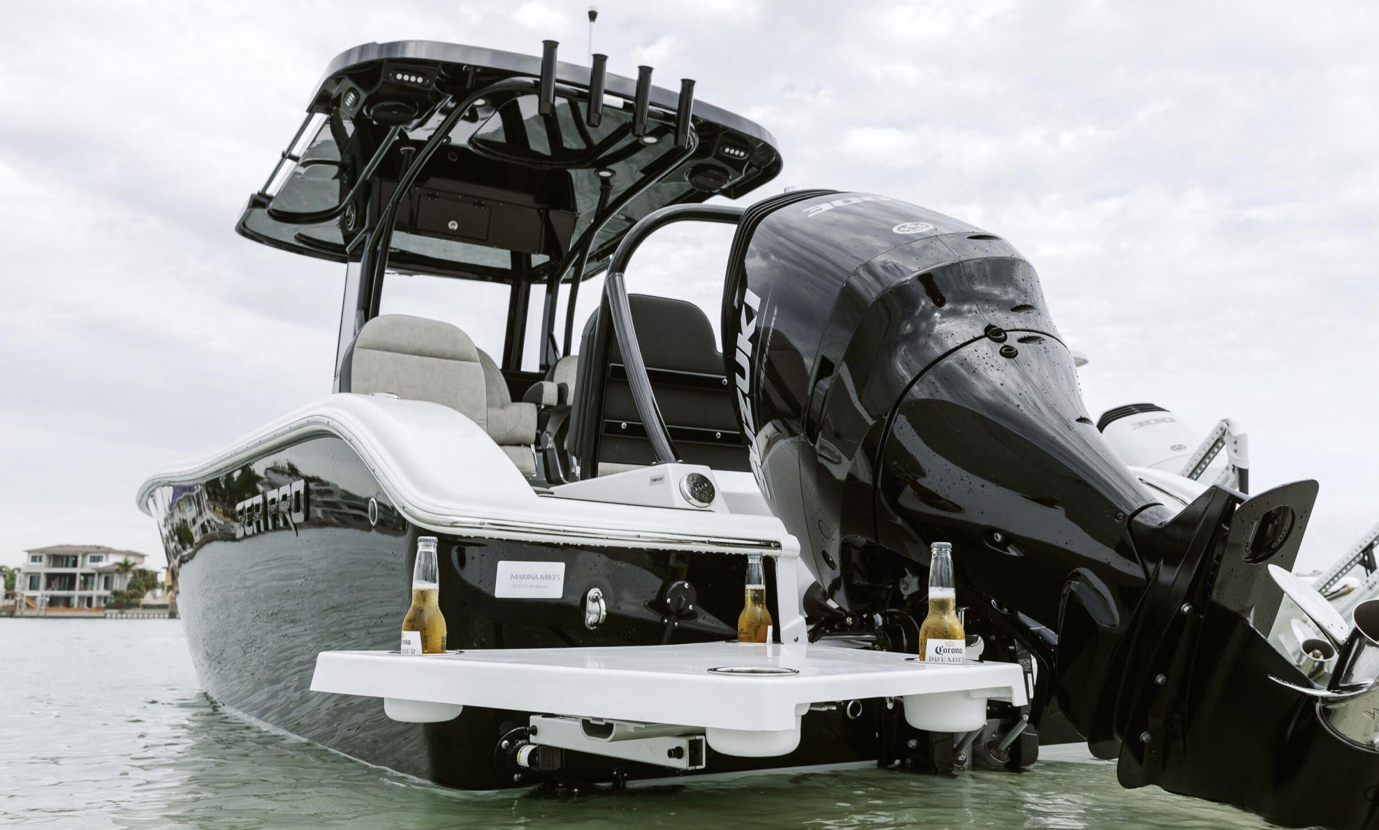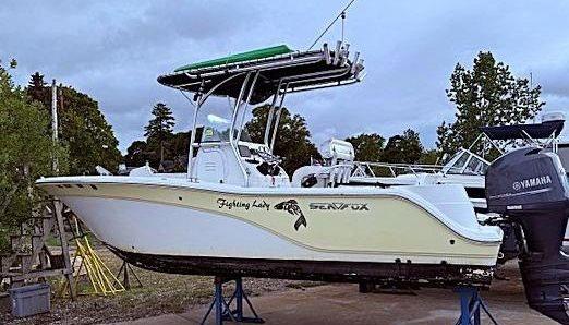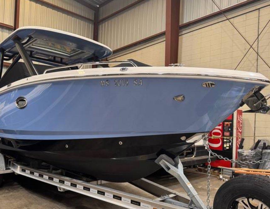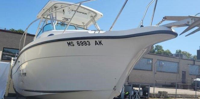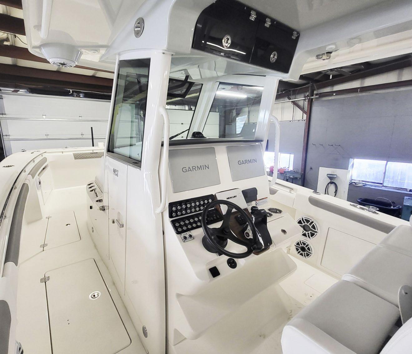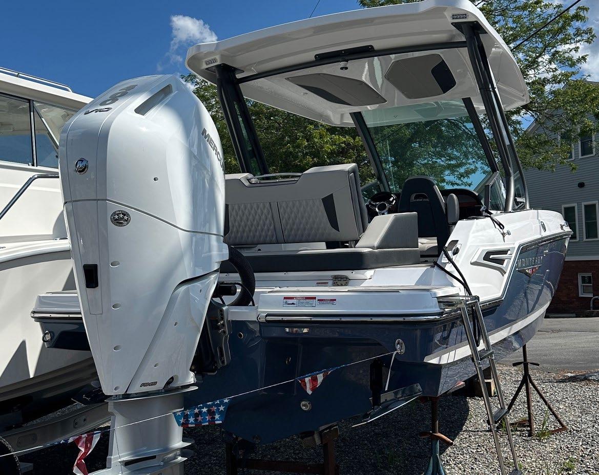 hardtop, frame powder coated, full windshield, elec head w/holding tank bow seating pkg, Scarab offshore pkg rocket launchers, gray stripe, S/S prop, lots of standard features. Includes freight & prep.