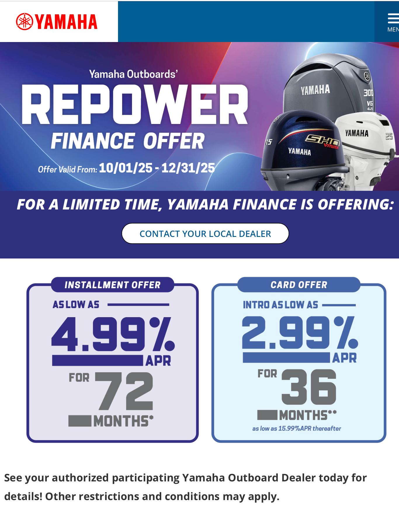 1Available for well qualified tier 1 credit customers who finance through Yamaha Motor Finance Corporation, U.S.A. Offer valid 10/1/2025 – 12/31/2025. 6.79% APR financing for 72 months at $16.95 per month per $1,000 financed based on pricing of 90% LTV or less, sales at MSRP will require 10% cash down plus payment of all taxes and fees to qualify. Must take delivery from retail stock by 12/31/2025 on purchase of new (unused and not previously warranty registered) eligible in-stock 2019 – 2026 Yamaha Sport Boat models. Available on approved credit through Yamaha Financial Services. Not all buyers will qualify. Promotional rates are based on creditworthiness. Higher financing rates apply for buyers with lower credit ratings and/or transactions with higher LTV rates.