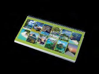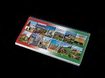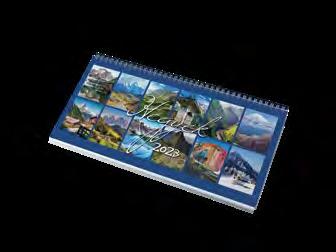 2023-as KÉPES ASZTALI NAPTÁR Ikerspirállal összefűzött naptárak heti beosztással, 12 színes képpel, színes műbőrrel borított fekvő tartóval. Egyediesítés: présfólia, vakdombor, szita. Asztali naptár