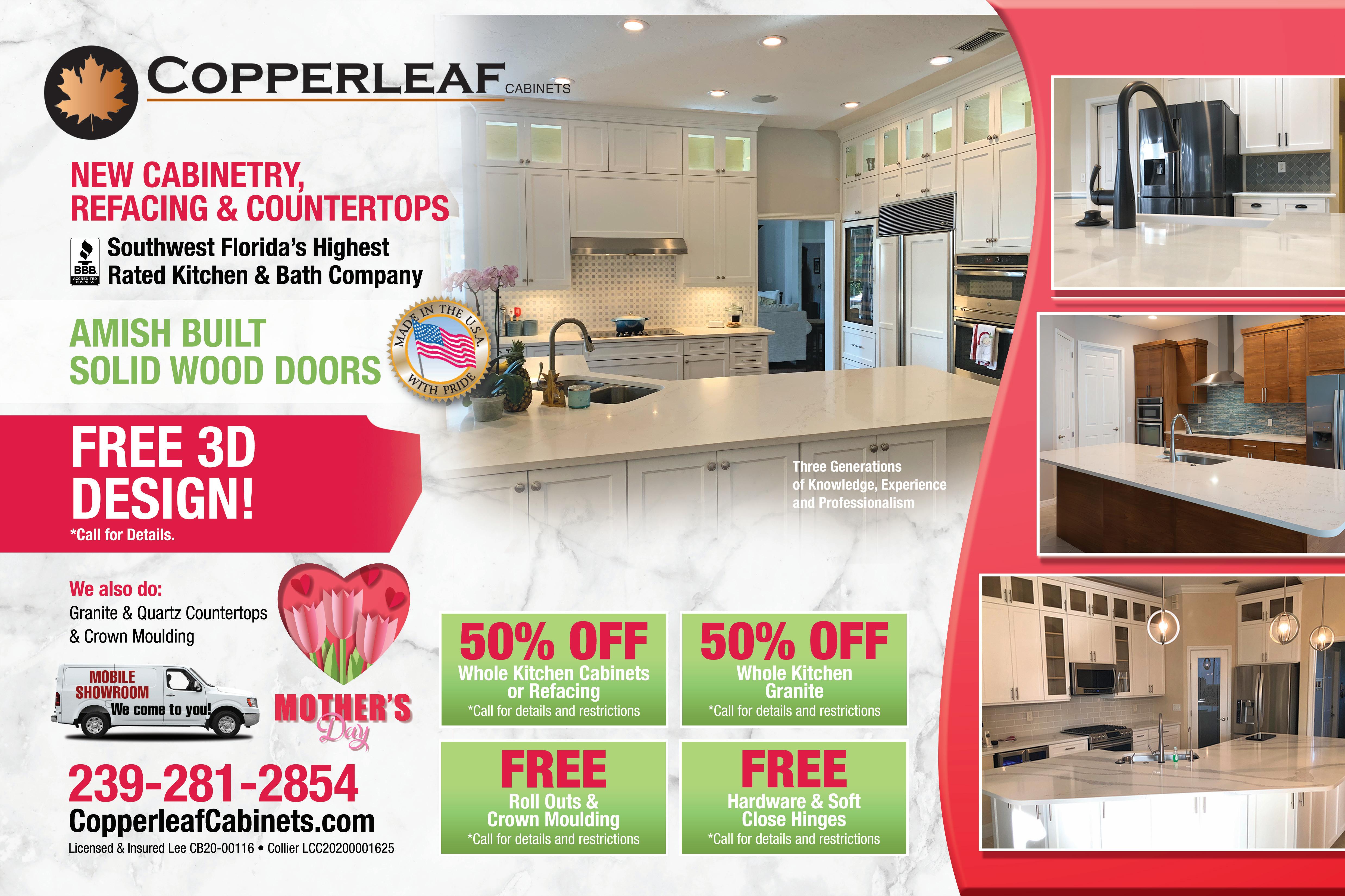W E ALS O D O : • Granite & Quar tz Counter tops • Crown Moulding Southwest Florida’s Highest Rated Kitchen & Bath Company CopperleafCabinets.com REFACING, NEW CABINETRY & COUNTERTOPS 10% OFFIn addition to any other discount Exp. 5/31/23 50% OFF NEW OR REFACED CABINETRY *Call for details and restric tions. Exp 5/31/23 tions. Exp 5/31/23 FREE Roll O uts & Crown Moulding / Hardware & S oft Close Hinges KITCHENS, BATHS &MORE KIT HENS, ATHS 50% OFF WHOLE KITCHEN GRANITE *Call for details and restric tions. Exp 5/31/23 AMISH BUILT SOLID WOOD DOORS Licensed & Insured Lee CB20-00116 • Collier LCC20200001625