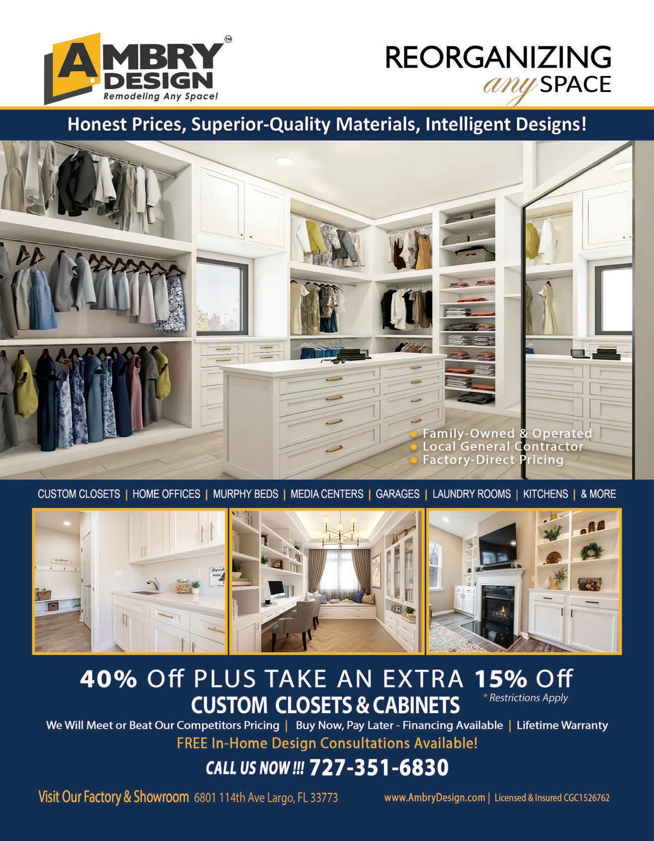 PINELLAS Available Online at www.BestDealsBook.com JUNE 2024 12 Months Interest Free Financing Available www.ClosetsByDesign.com 1-888-258-4081BDB CUSTOM CLOSETS • GARAGE CABINETS • HOME OFFICES • MEDIA CENTERS IMAGINE YOUR HOME, TOTALLY ORGANIZED COMPLIMENTARY IN-HOME CONSULTATION Not Valid with any other offer. Valid with incoming order, at time of purchase only. 40% Off & FREE INSTALLATION On any order of $1000 or more. 15% OFF plus an additional 12 Months Interest Free Financing Available