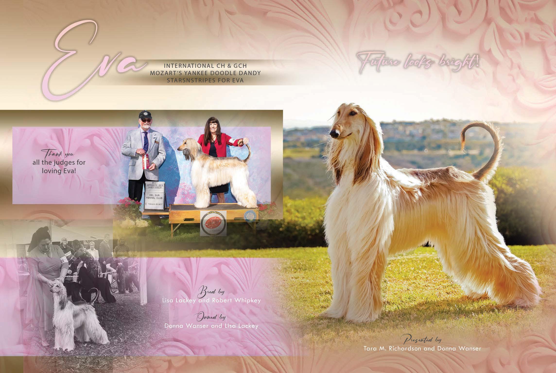 I have been extremely fortunate to have numerous mentors who have played a crucial role in laying the foundationofmyhandlingskillsanddogknowledge,but my most prominent mentor has been Alicia Morrison Jones. Alicia happens to be my mother’s best friend and one of the most exceptional sighthound handlers of all time. She excels in her conditioning and presentation of many breeds, especially Afghan Hounds, and has always supported me. Alicia has been watching me ringside since I was a little girl with a dog twice her size and continues to do so now. She provides me with valuable feedback on how I can continue to improve, and I am forever grateful to her.