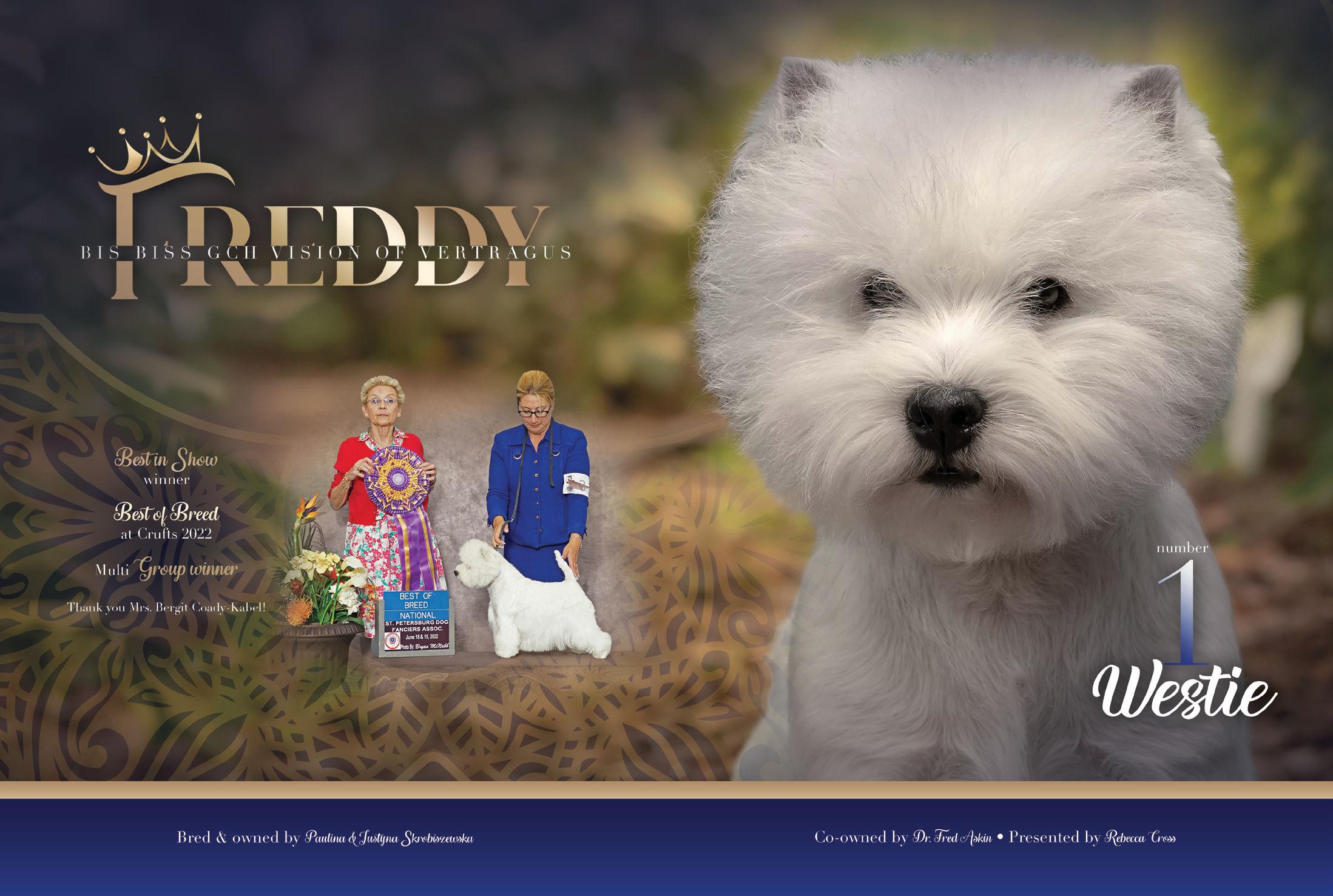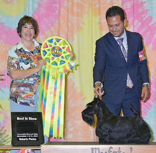 • BIS GCHG CH McVan’s Stardust, aka Dusty Rose, who was the number one Scottish Terrier all systems in 2021 and is now the proud mother of four puppies. She was handled by Christian Rangel.