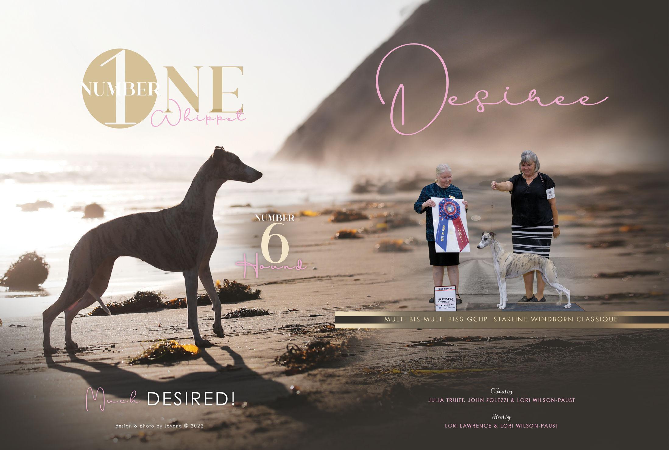 I always love hearing stories about legendary dogs from the past. The famous Whippet bred by Lori and Carey Lawerance, Chanel, BIS BISS GCHP Starlines Chanel, JC, handled from 2009-2012 by Lori Wilson is most definitely one I wish I could have handled. Her resume is truly outstanding. She went on to win the group at the prestigious shows AKC/Eukanuba Invitational and Westminster Kennel Club. She also won Best in Show at major venues such as Morris and Essex, Devon Dog Association, and the Palm Springs Kennel Club. She accumulated over three hundred group one wins, 72 BIS, and numerous BIS specialties. She achieved the status of number five all-breeds and number one hound from 2010-2011. All accomplishments breeders dream of achieving. It would have been an incredible experience to be at the end of her lead.