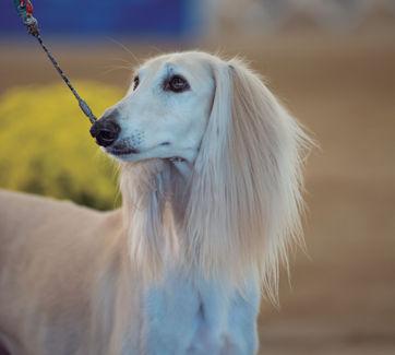 Afghans, and notably several of the males went on to become very influential sires and top producers. Karim, Am., and Can. Ch. Karim Zahab Al Bokay was a Saluki that I was able to purchase at 13 months old, and I gave him to Julie as a gift. Julie was recovering from a near fatal car accident and Karim proved to be the best healing medicine. He is the foundation for all the Aurora Salukis. He defeated more dogs in competition than any other Saluki to compete in the USA. Karim was bred by Bob and Kathy Clemenson, of Bokay Saluki fame, and he was the first Saluki to ever be ranked in the Top Ten All Breed Rankings for a year. He won the national specialty three times, two of those from the veteran’s class, 30 All Breed Best in Shows, and 197 Hound Group wins. This was during a time when at any given show, the Hound Group would be steeped with Best in Show winners, so winning the Hound Group was very tough to say the least. To this day, I wish that I owned an Afghan Hound and would be able to compete. I am a purist at heart, and the presentation (grooming) of the Afghan Hound is defined very clearly in the AKC breed standard as “shown in its natural state, the coat not clipped or trimmed.” Grooming is an art and preparing an Afghan Hound for the show ring takes patience, time and a respect for the AKC standard. Amongst all the Best in Show winning Afghan Hounds I have handled, two are very notable. Ch. Elmo’s Tutankhamun and Ch. Jorogz Heartbreaker, both dogs are still having a great influence on the breed today and are top producers.