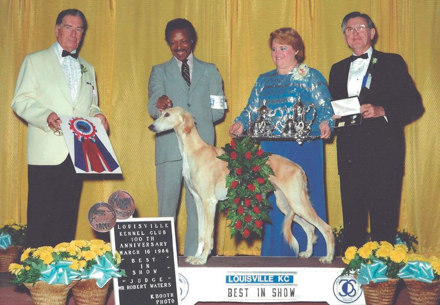 Karim winning Best in Show at the Louisville Centennial Show. That was a night to remember. Each group winner was a top winning dog, and to receive the Best in Show blanket of roses from legendary judge Robert Waters was unforgettable. That was in 1986 and Karim won BIS from the Veterans class. Youhavehandledsomeofthemostfamoussighthounds in the sport, who are some of your favorite dogs that you have handled?