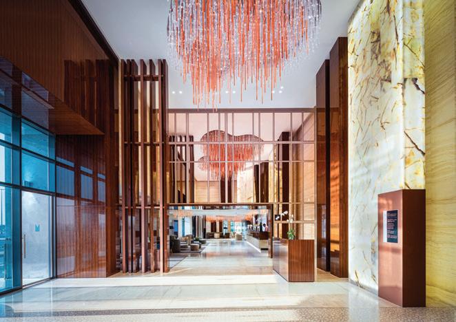 The interior blends a vibrant colour palette with exquisite materials. Some 1,790sqm of 24-carat gold leaf was used to embellish the interior and an estimated 86,500 individual hand-fixed pieces of Swarovski crystals have been etched into the frame of the mirror in the Junsui bar and the entrance.