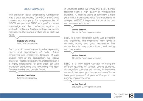 EBEC Final Warsaw The European BEST Engineering Competition was a great opportunity for IVECO and CNH to present our company for engineerstobe. At IVECO, we perceive EBEC as a platform where knowledge can be confronted against the realworld problems. As the employer, we send a message to the students what sort of skills we need. IVECO representative