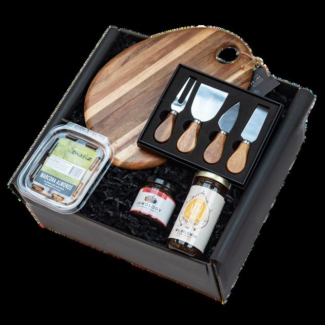 fried salted almonds Mission Figs Preserves Acacia wood Pebble Shaped Serving Board 12" x 9"m Boxed Cheese Spreader Set