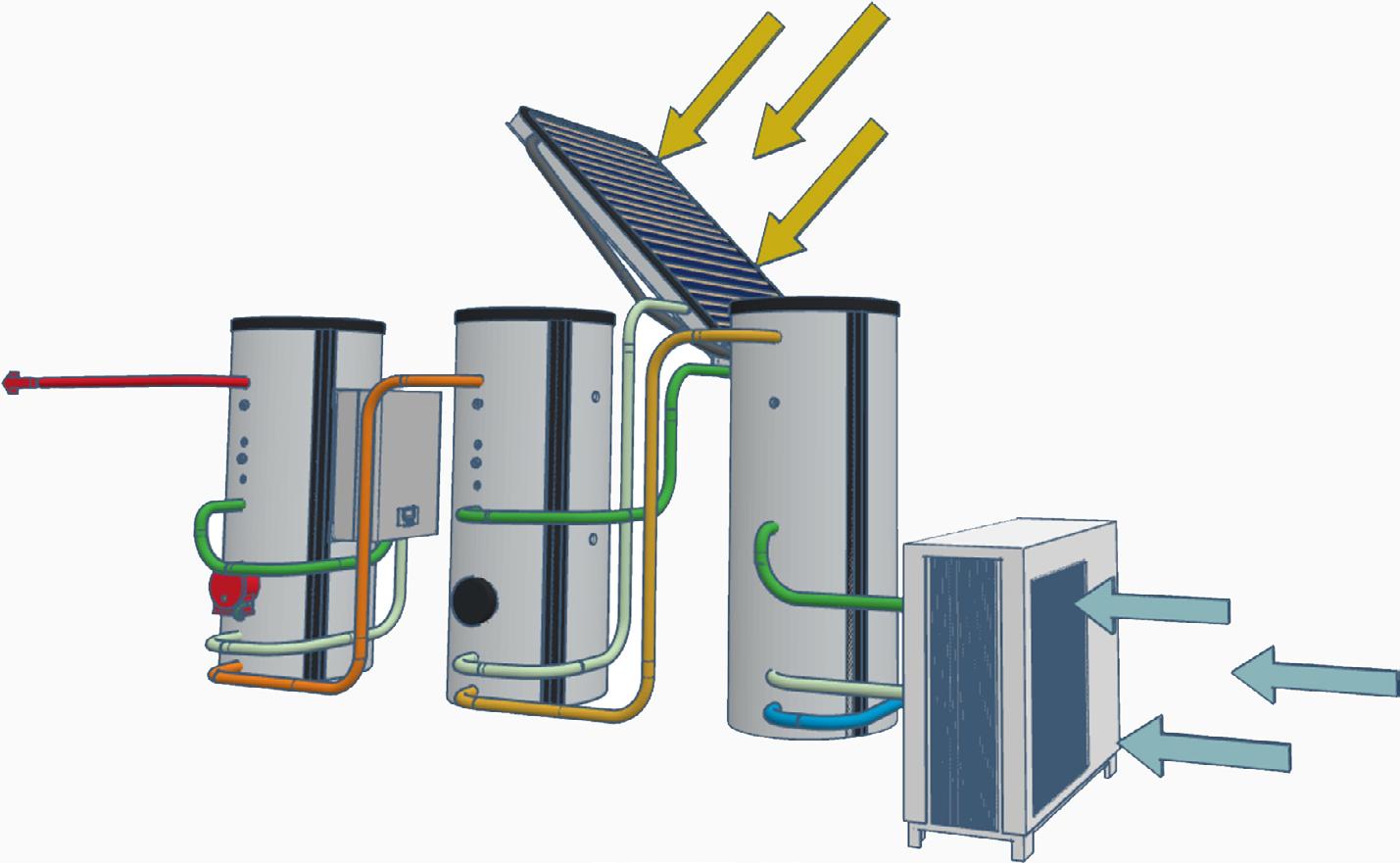 This hybrid approach can be further extended with the inclusion of air source heat pumps to provide the initial pre-heat for the system. Operating at lower temperatures with the cold feed maximises the efficiency of the heat pump, reducing electrical operating costs and raising working flow temperature from 10°C to 40°C. This is not hot enough for commercial applications, so the pre-heated water is then passed to the mid solar thermal system. Essentially free to operate, the solar thermal system boosts the working flow temperatures from 40°C to at least 50°C. Although not operating at maximum potential, there is enough advantage gained from solar thermal to