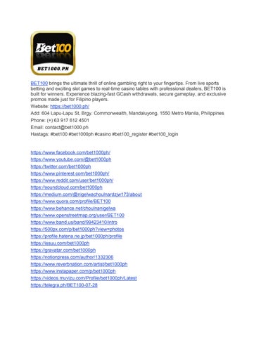 BET100 brings the ultimate thrill of online gambling right to your fingertips. From live sports betting and exciting slot games to real-time casino tables with professional dealers, BET100 is built for winners. Experience blazing-fast GCash withdrawals, secure gameplay, and exclusive promos made just for Filipino players. Website: https://bet1000.ph/ Add: 604 Lapu-Lapu St, Brgy. Commonwealth, Mandaluyong, 1550 Metro Manila, Philippines Phone: (+) 63 917 612 4501 Email: contact@bet1000.ph Hastags: #bet100 #bet1000ph #casino #bet100_register #bet100_login