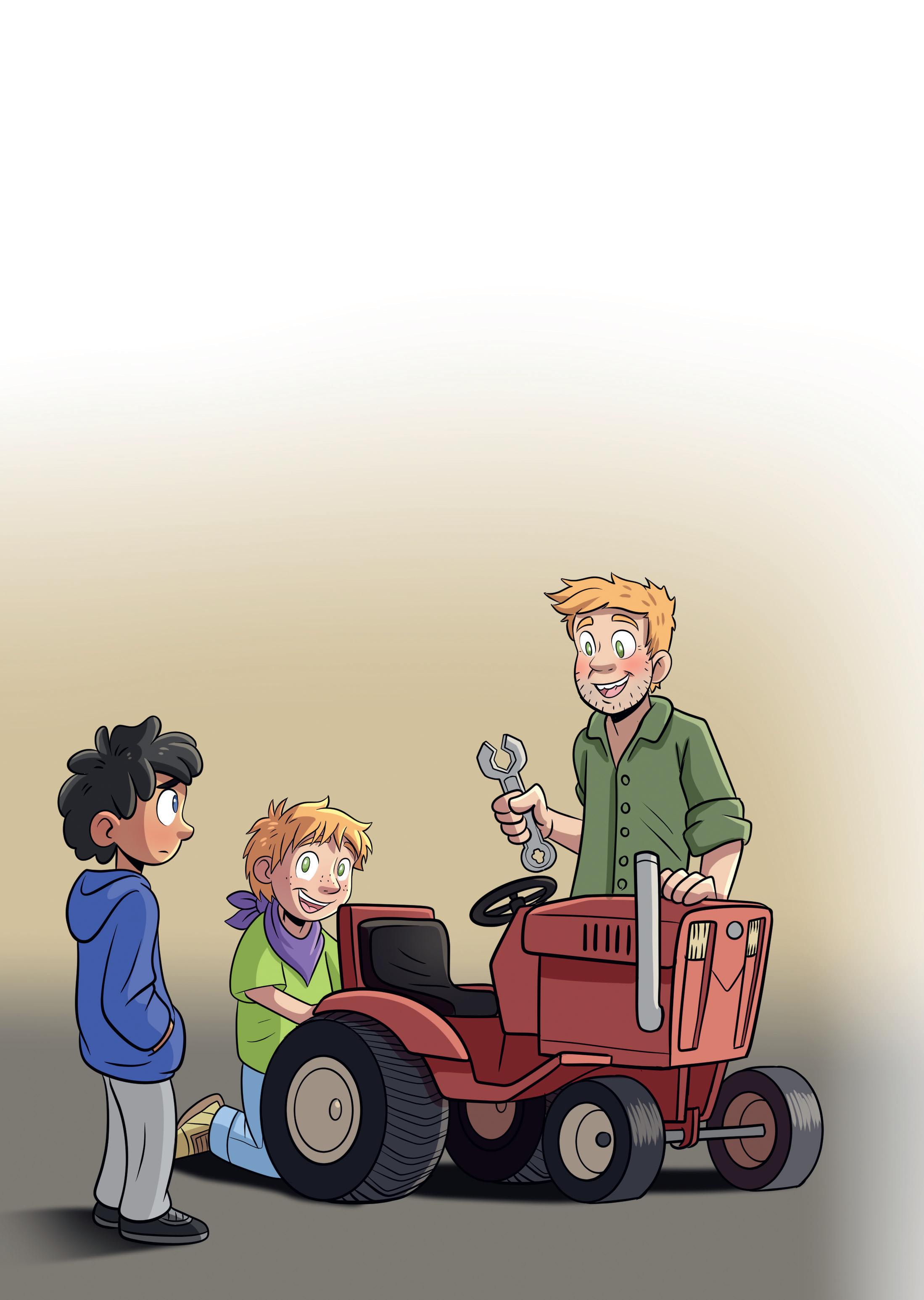 Sonja är Eddies farmor och Jons bonusfarmor. Sonja är inte där. Men Eddie har sällskap av sin pappa, Stefan. Han sitter på huk bredvid en röd trädgårds-traktor.