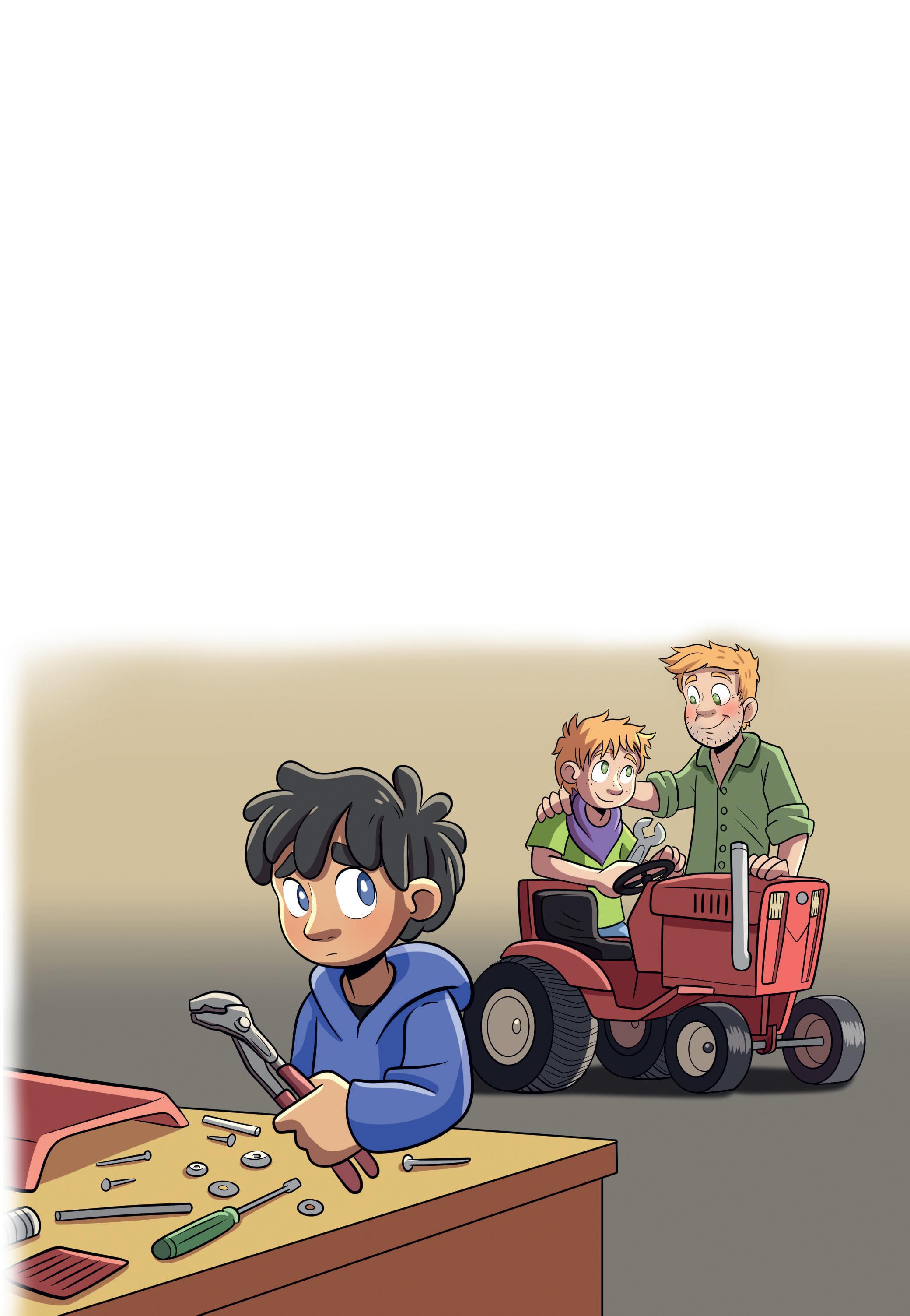 Eddie och Stefan är så upptagna. Det värker lite i Jons mage. Han skulle också vilja ha en pappa som han kunde meka med. Kanske med trädgårds-