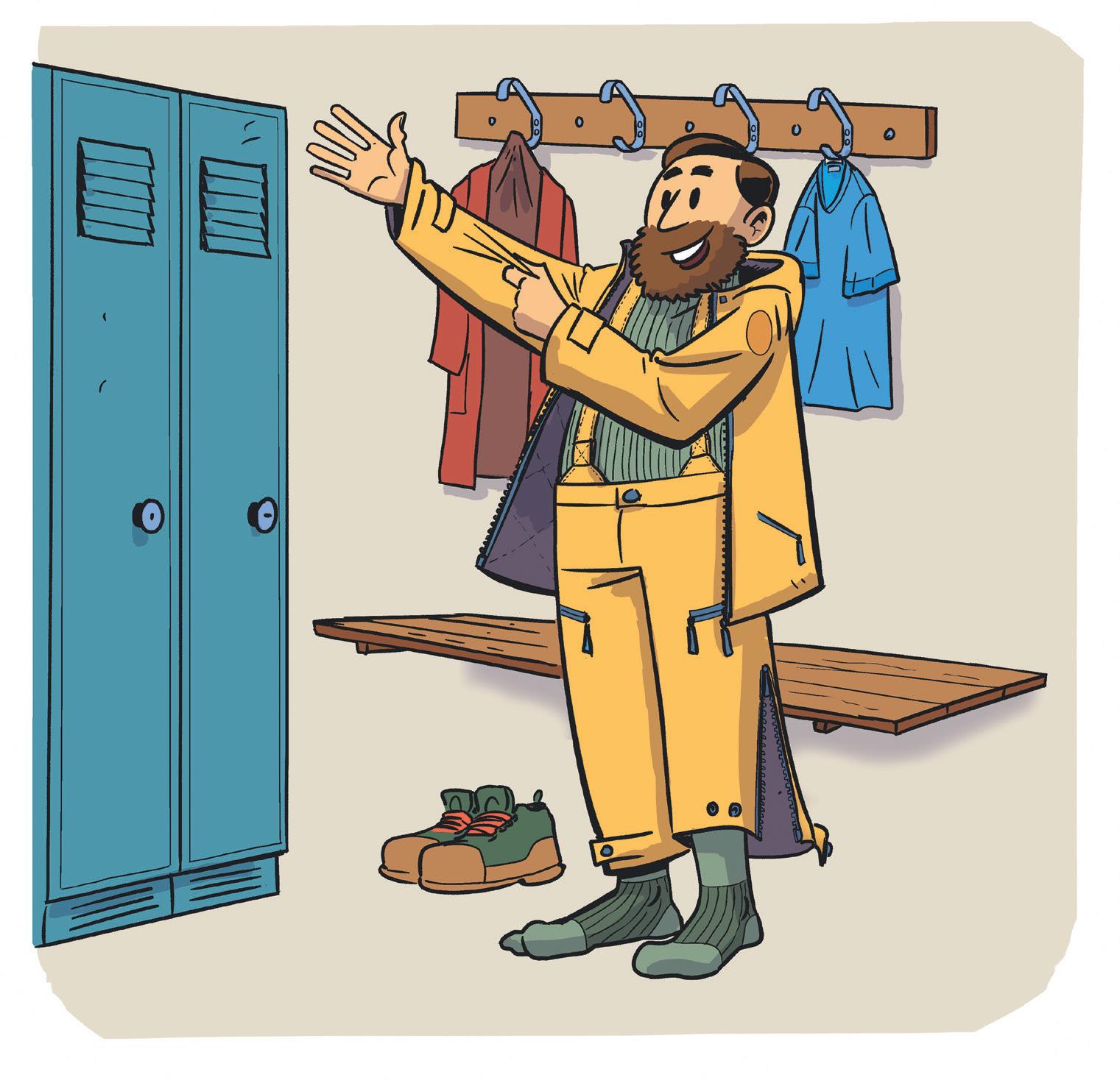 Först går Tage och Maja till omklädningsrummet. Där tar Tage på sig de ytterkläder han har när han jobbar.