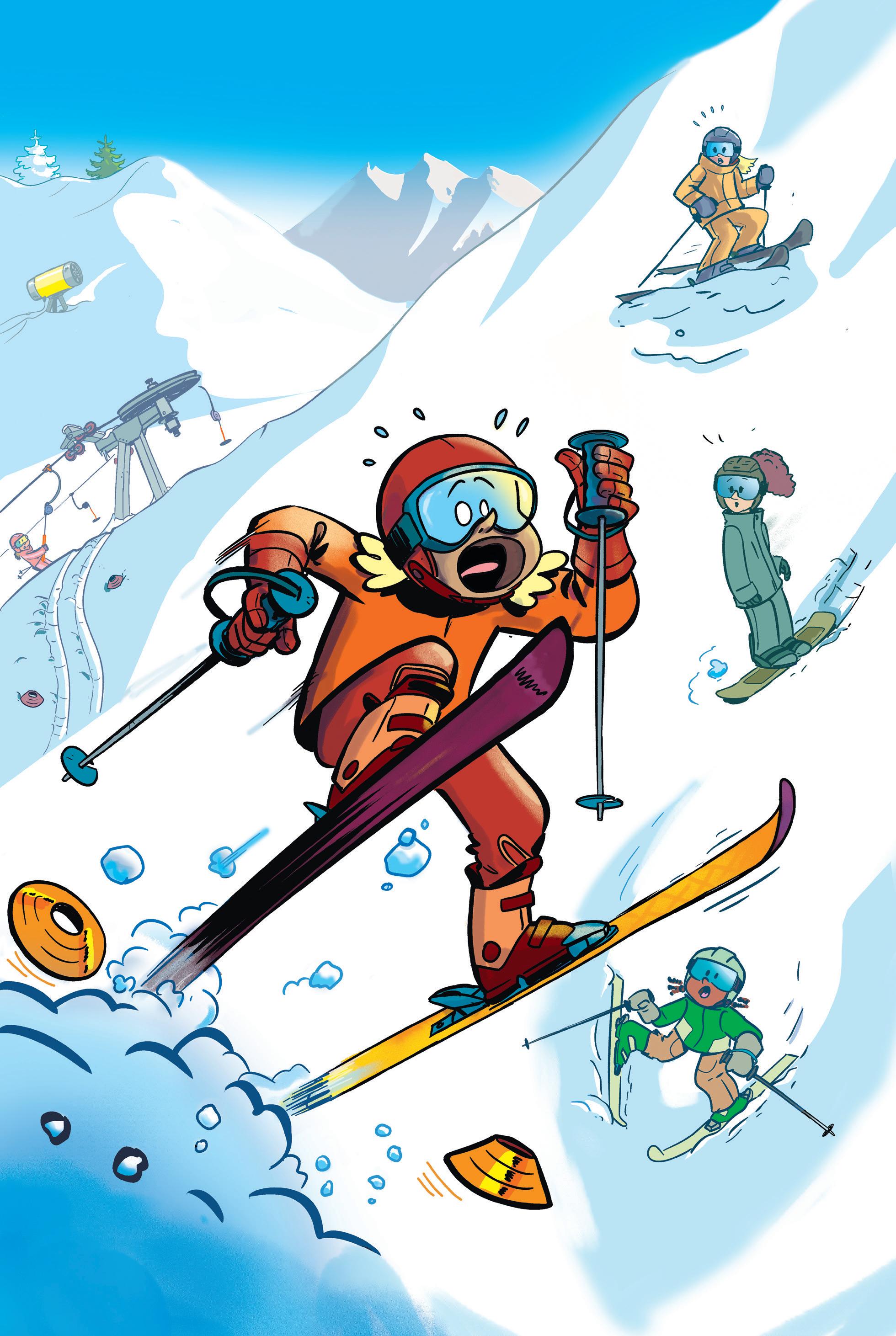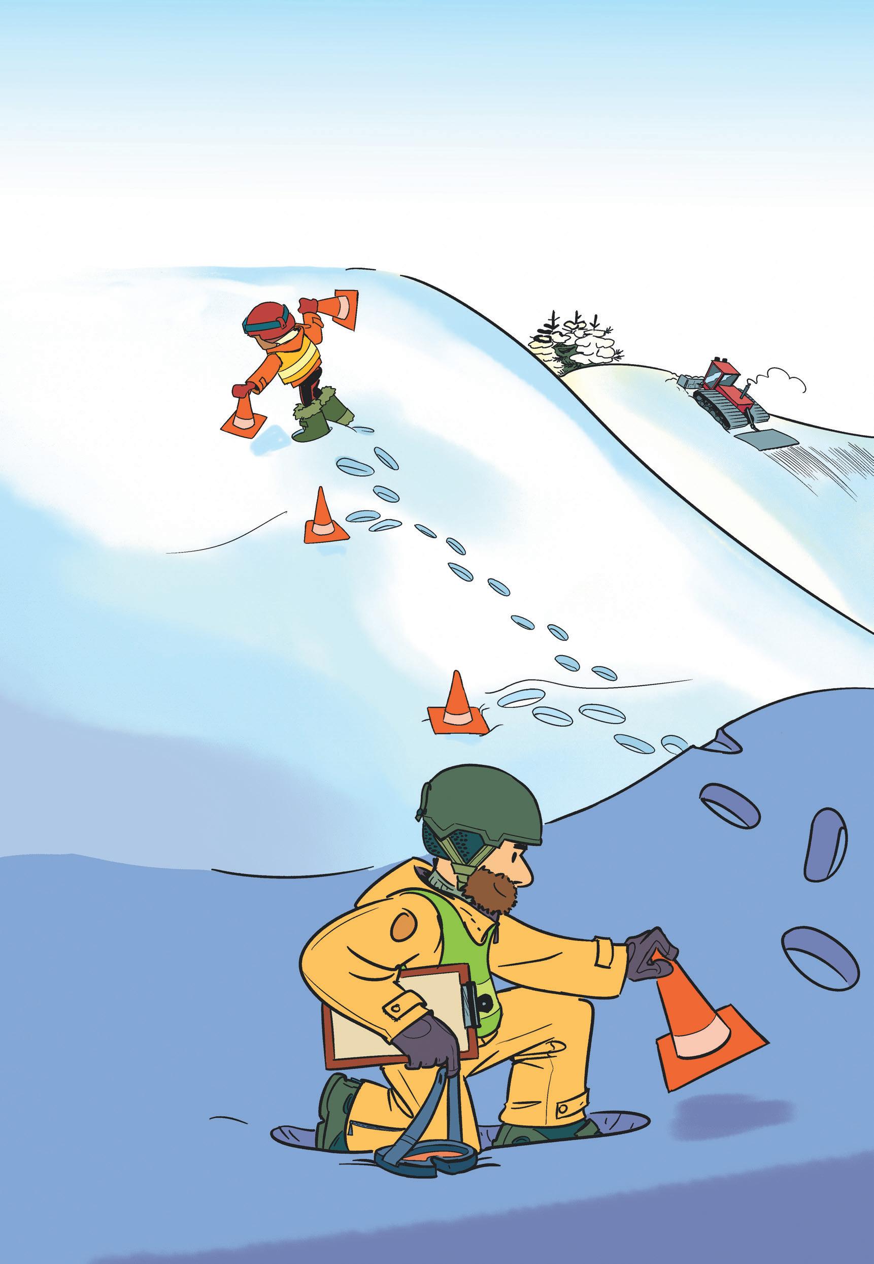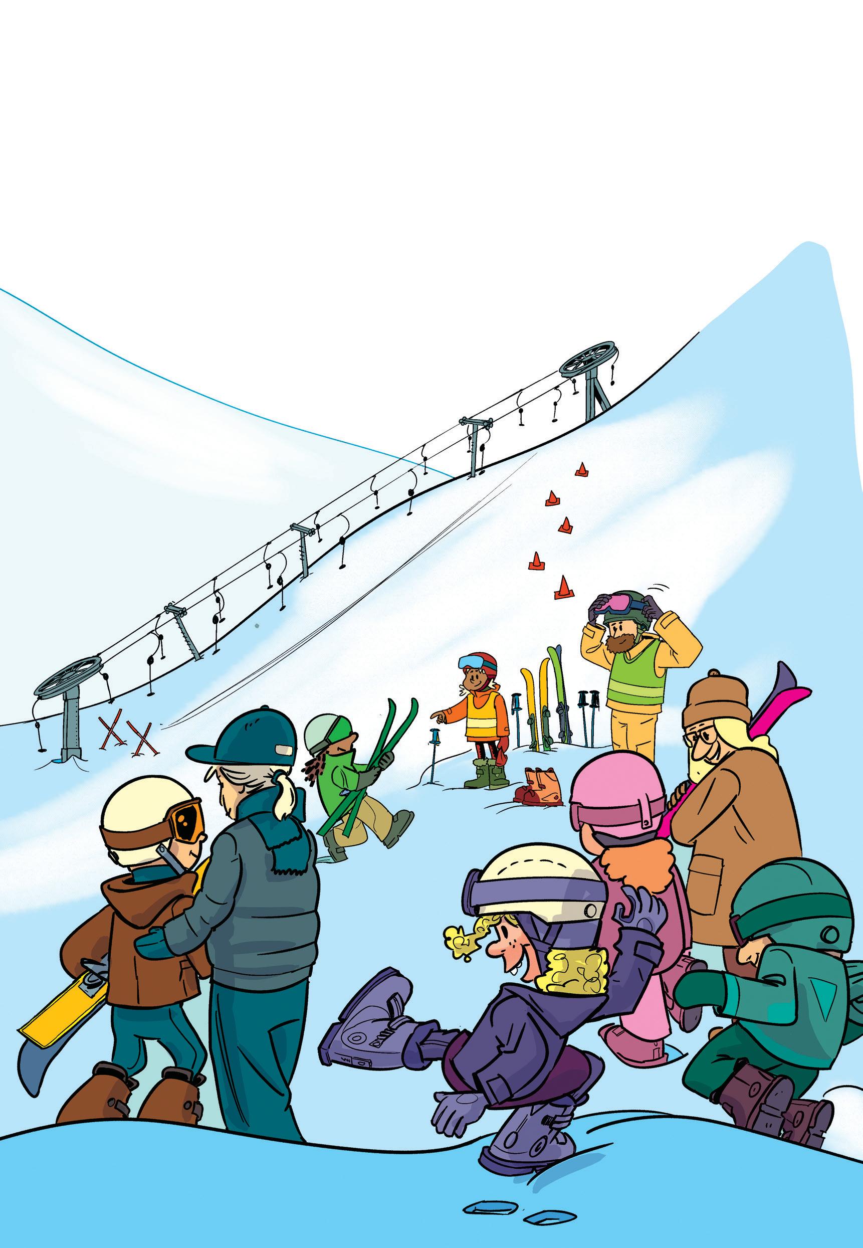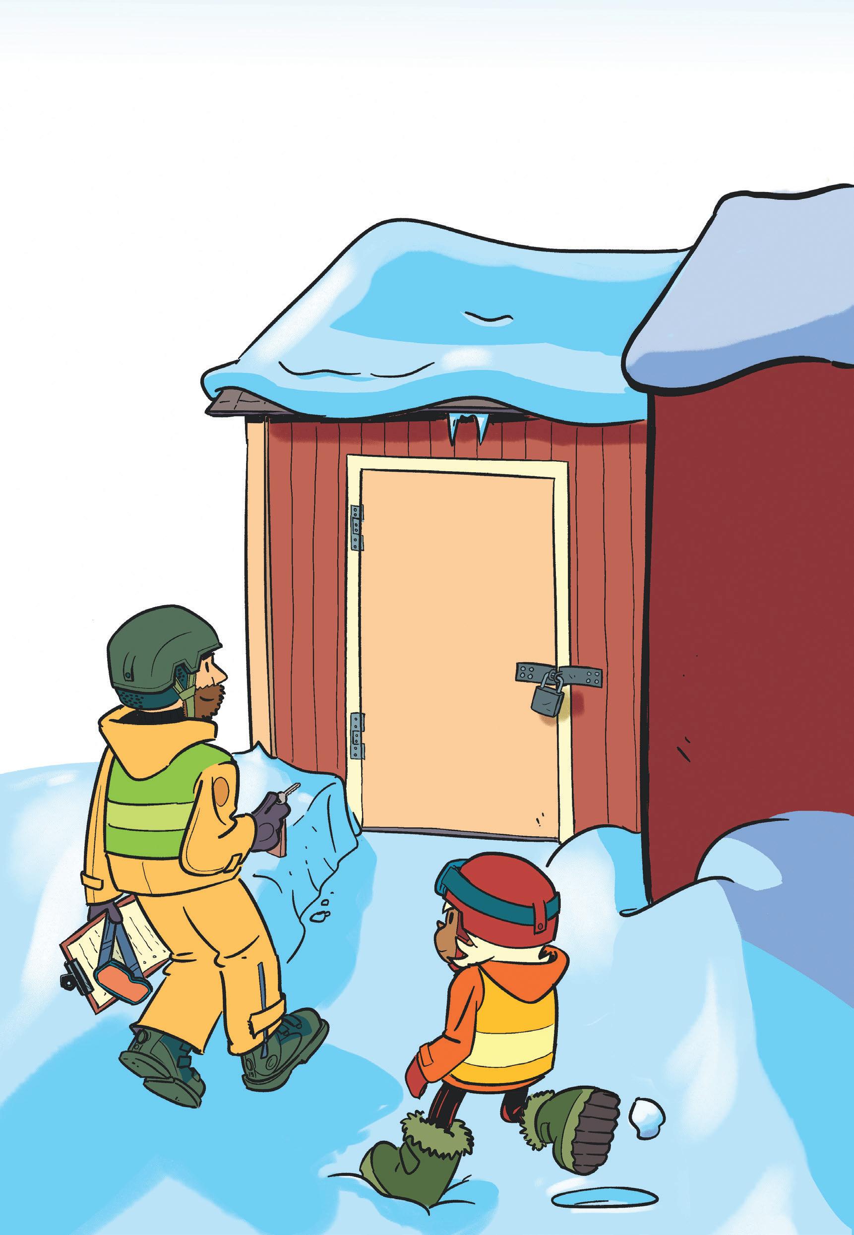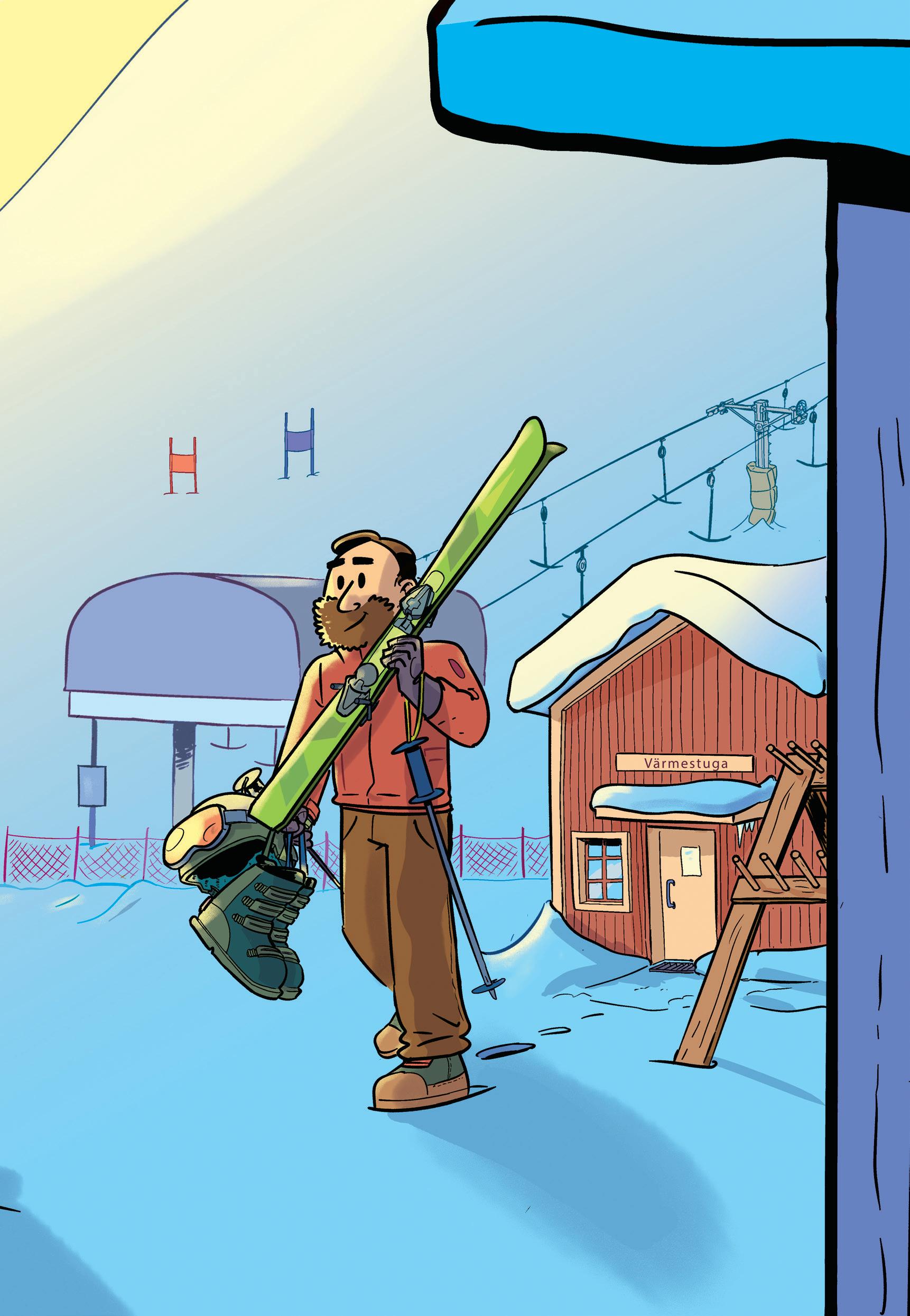 Maja möter Tage längst ner vid slalombacken. Maja har med sig sina pjäxor och skidor, och sin hjälm.