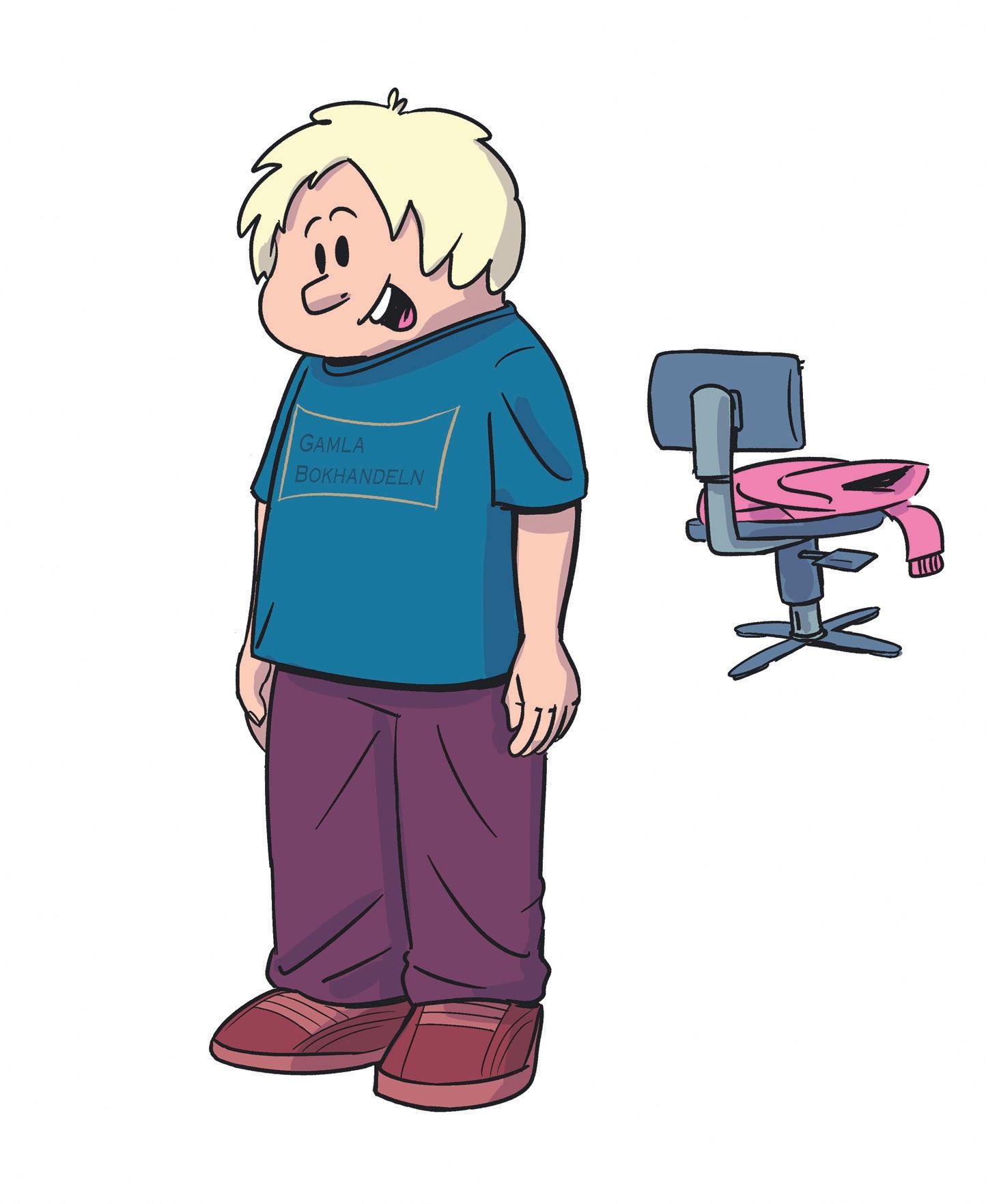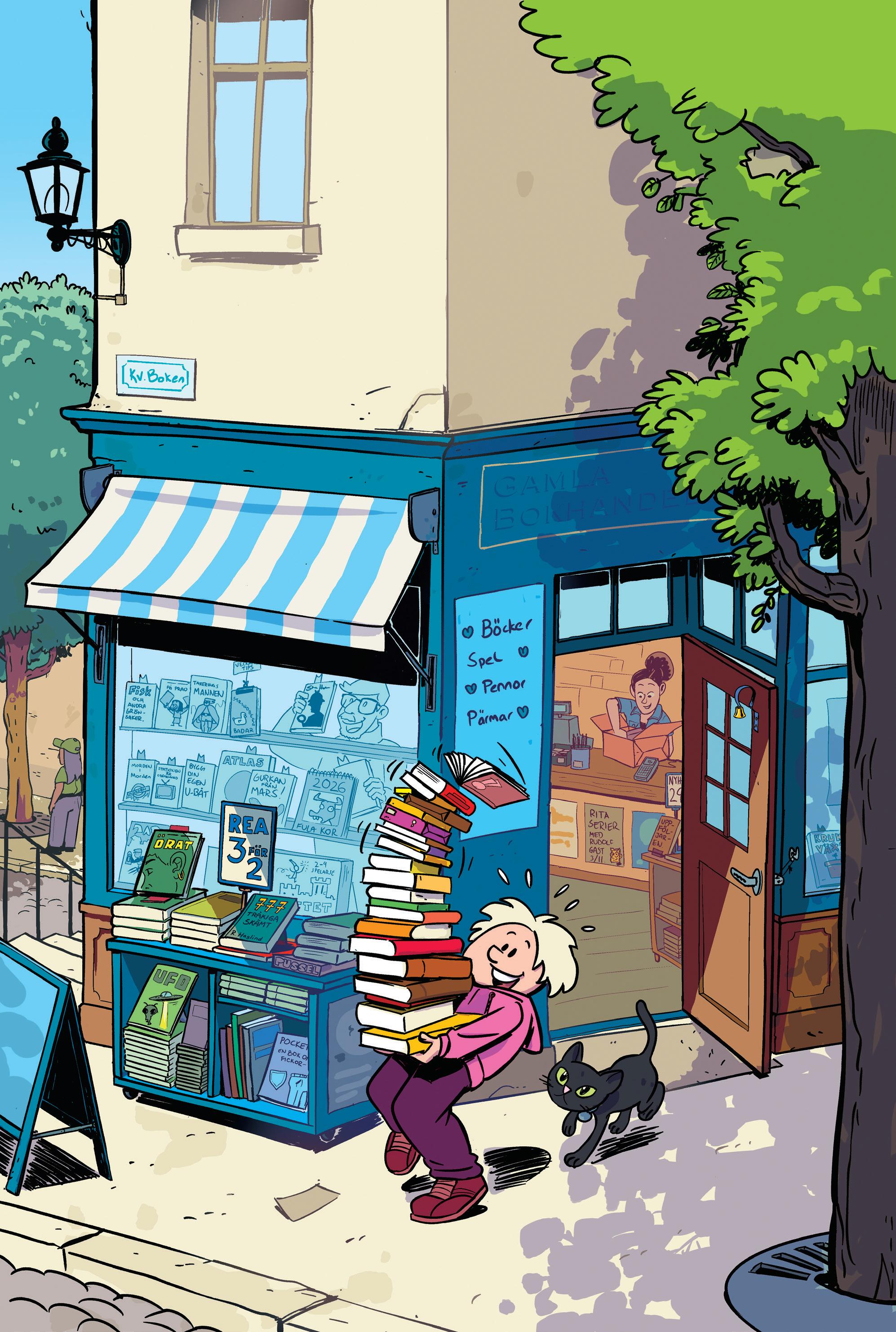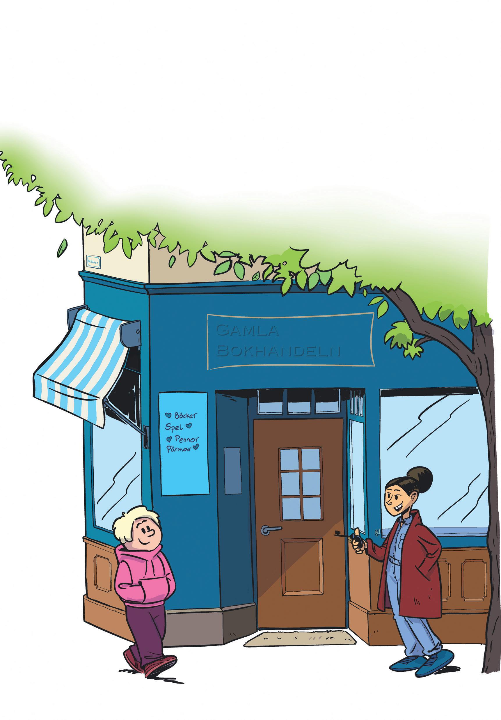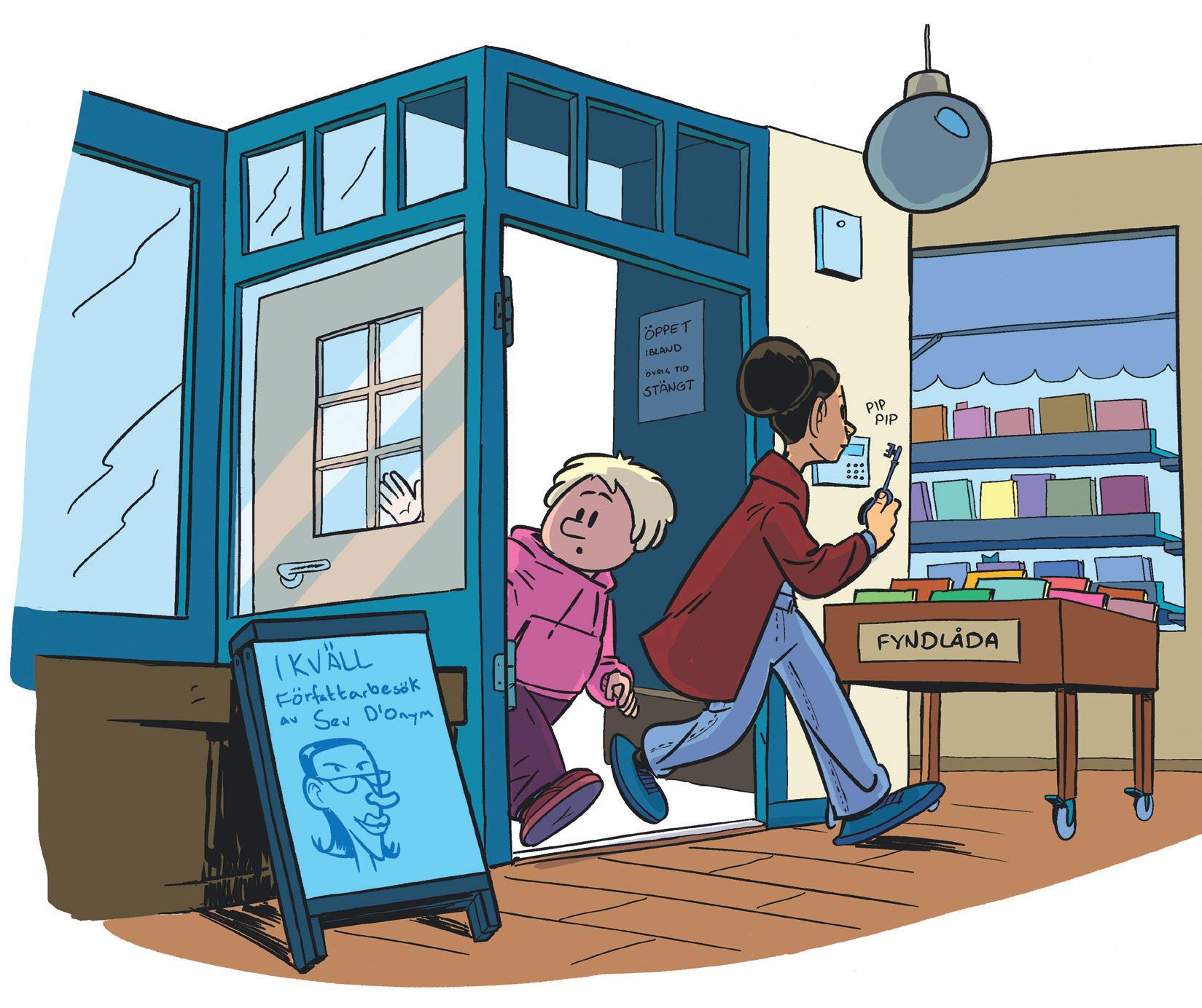 My möter Bosse vid dörren till bokhandeln. Den ska snart öppna för dagen.