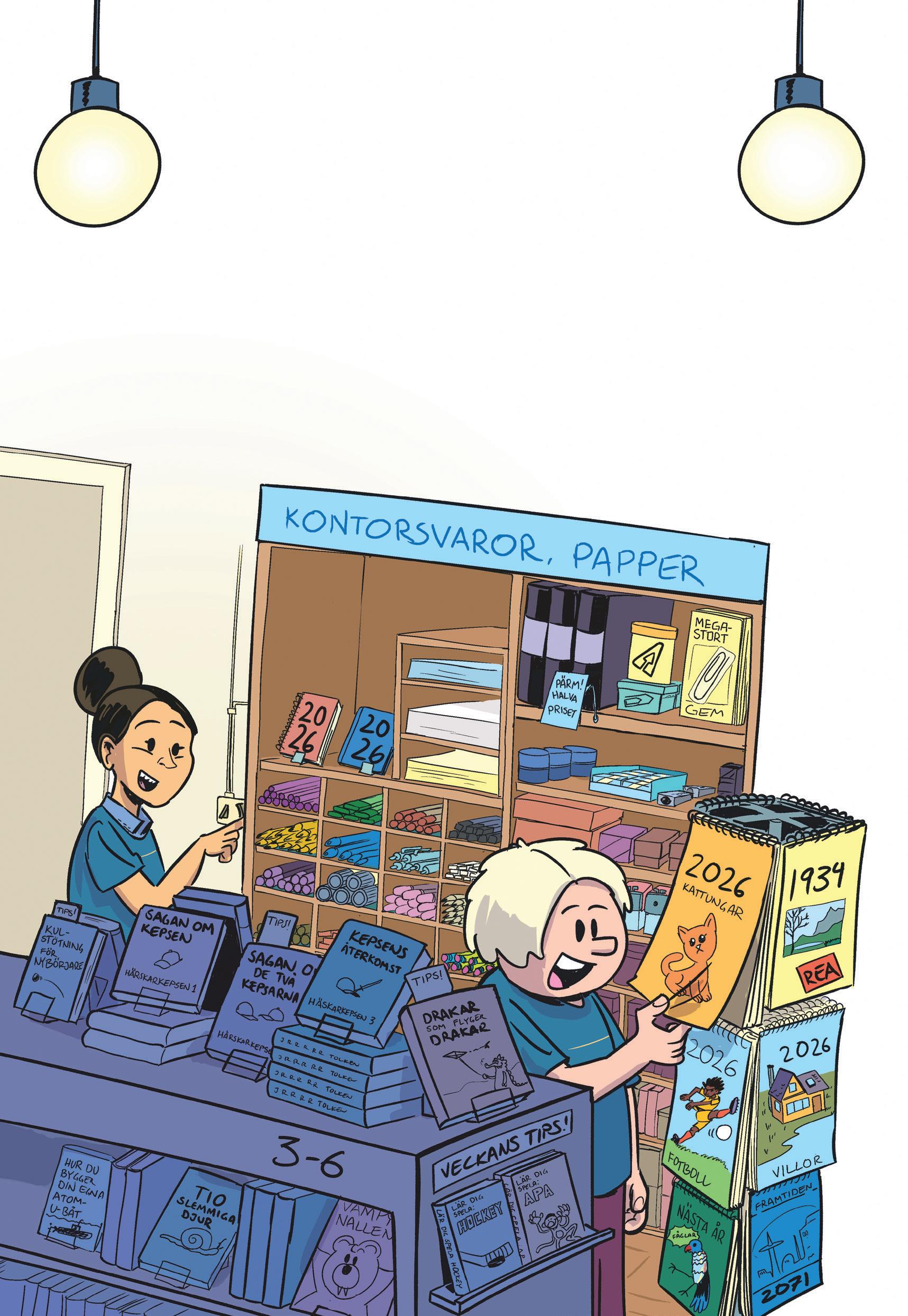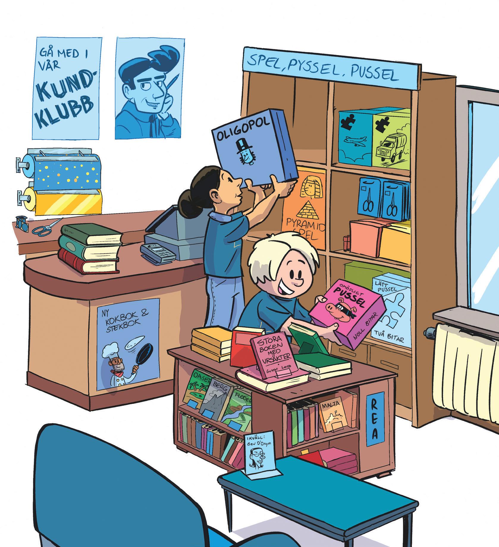 My visar Bosse var barnböckerna står. Och var det finns kontorsmaterial som papper, pennor, kalendrar och gem.