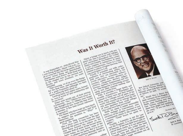 “Since I am a St. Lawrence Beta ofthe early 70s, I remember opening the front page of the magazine and seeing and reading with pride the “Inter Fratres” column by Seth R. Brooks, St. Lawrence 1922. I am hopeful and then disappointed when I open the current issues and the column is absent. I would like to suggest you reintroduce this feature to the magazine. If you’re considering this request, I suggest that the byline should be Bill Fox, St. Lawrence ’75. As a current university president, Bill is certainly aware of all the issues facing undergraduates, alumni issues, current crises and more. He also has a deeper appreciation for the “Inter Fratres” column than most.