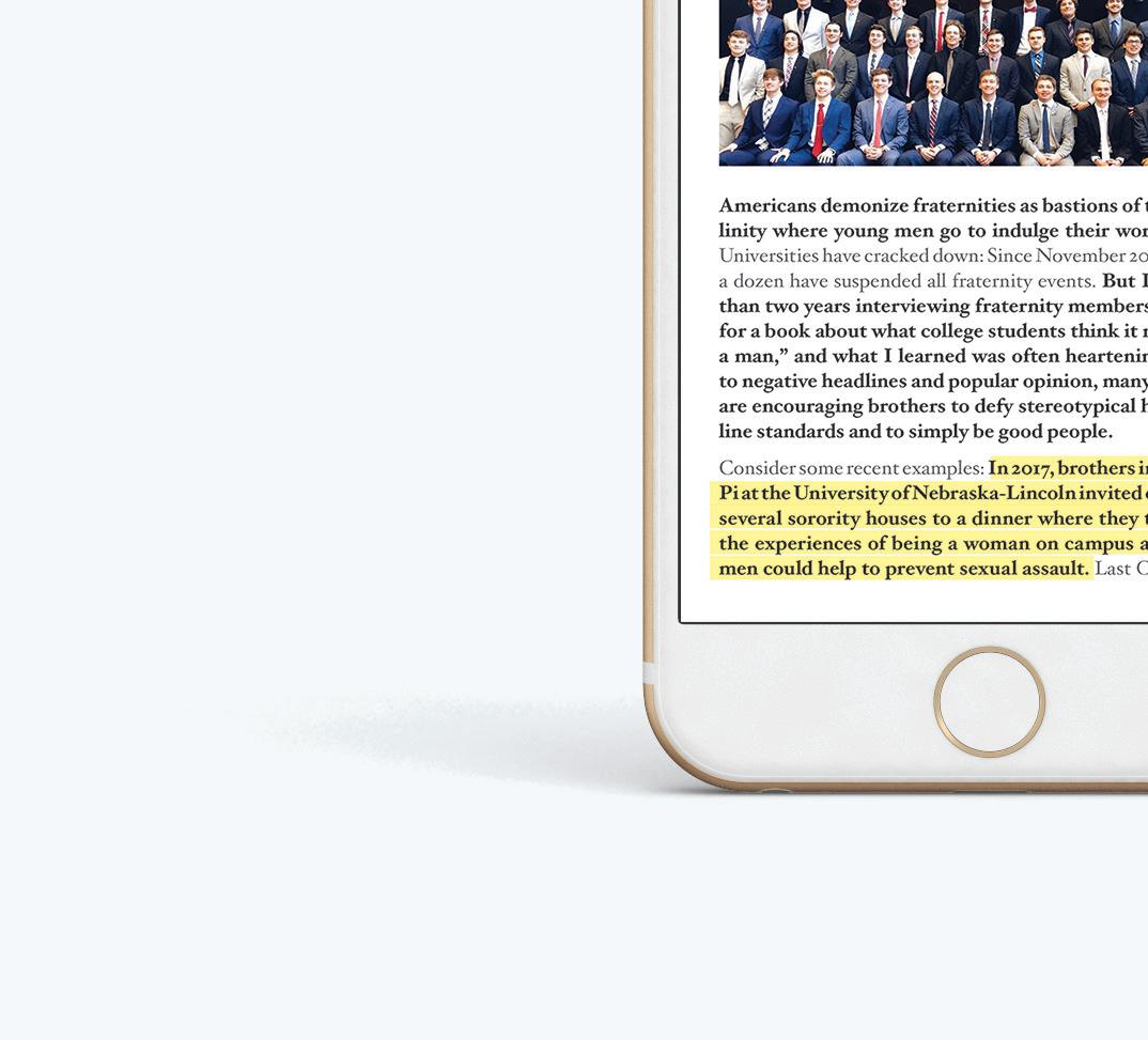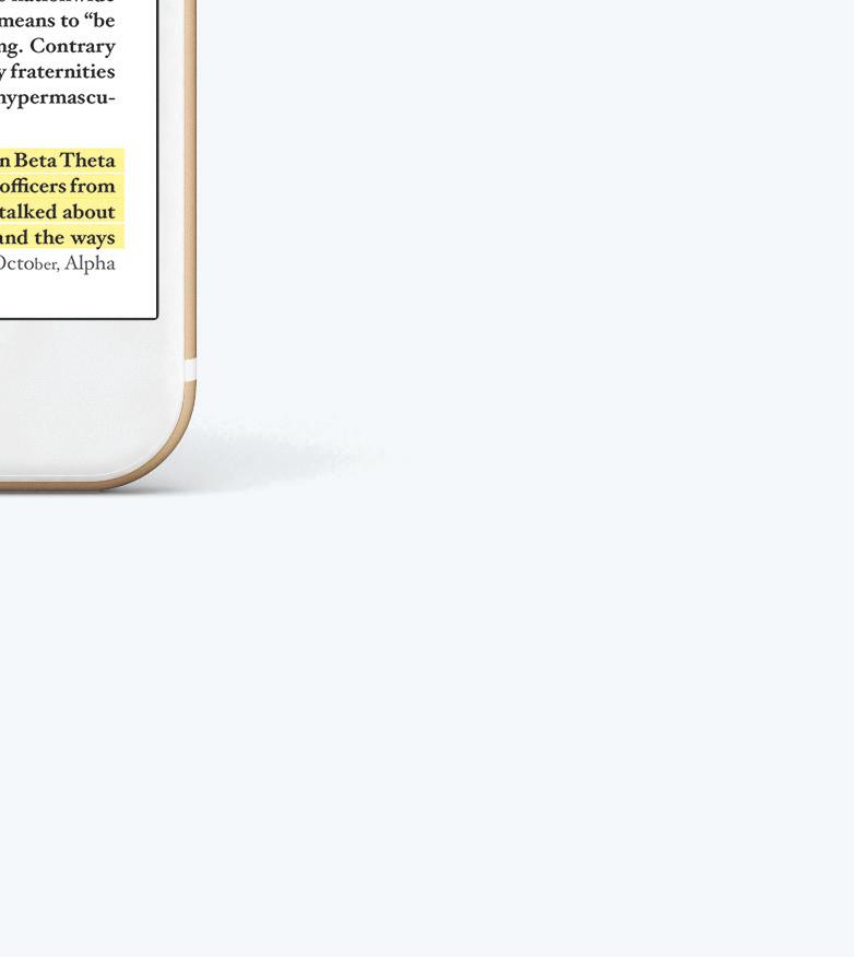 Upon initiation, each Beta is guaranteed a lifetime subscription to e Beta eta Pi. at commitment by the Fraternity remains, although for a variety of reasons some no longer wish to receive the hard-copy version. So, who automatically receives the Fraternity’s magazine? All undergraduates and parents, current and former Beta volunteers, donors to the Beta Foundation, and any alumnus who documents his preference to receive the hard copy with the Administrative O ce in Oxford. One can easily do so at 800.800.BETA, beta@beta.org or my.beta.org.