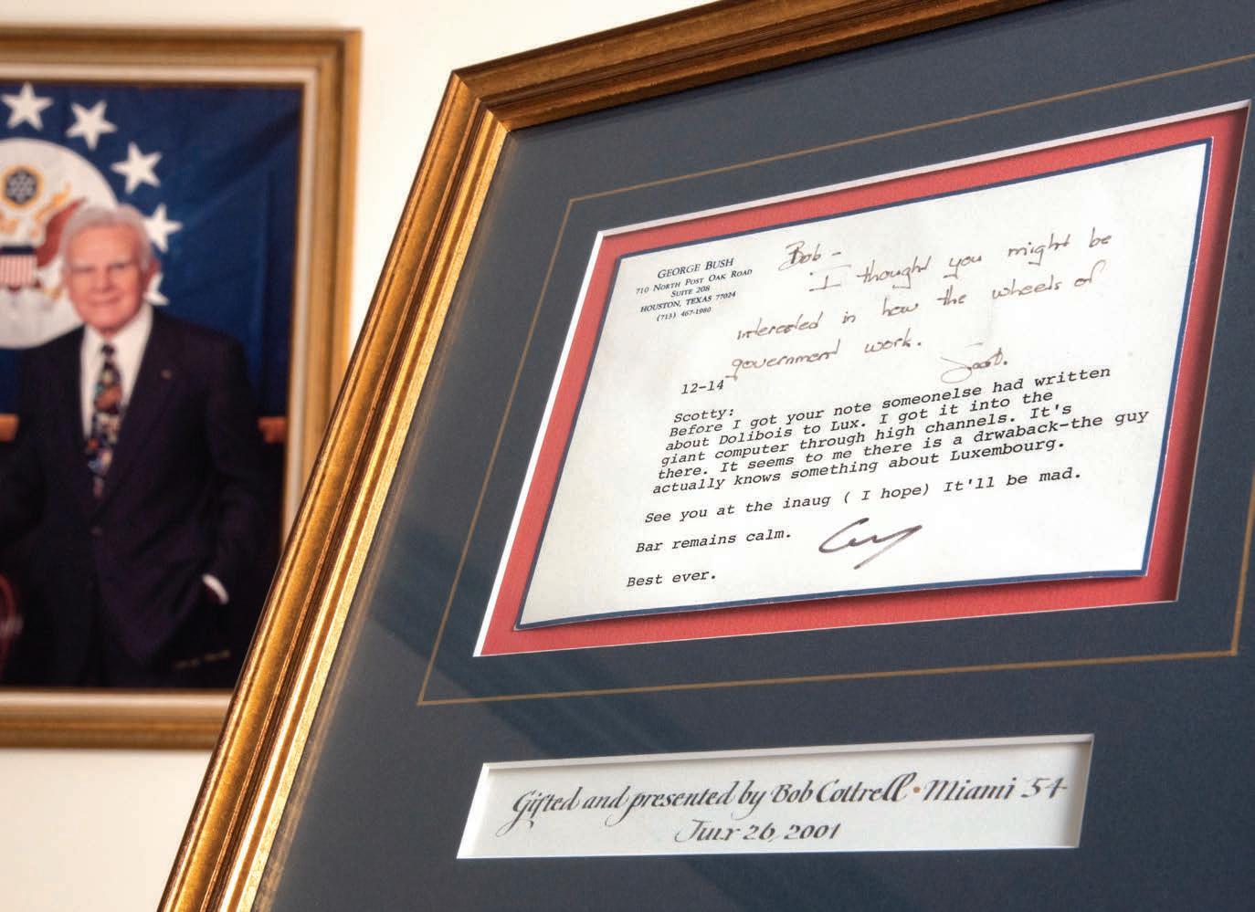 It is well known within the Fraternity that First Lady Barbara Pierce Bush was the daughter and sister of two loyal Alpha Chapter Betas. So, it came as no surprise when the Miami brothers of Luxembourg-born John Dolibois, Miami ’42 (background) – a U.S. Army World War II veteran and Nuremberg trials Nazi interrogator – advocated for his native country's ambassadorship to newly elected Vice President George H.W. Bush, Delta Kappa Epsilon at behind the scenes e ort came into fuller view during the 2001 Oxford Cup acceptance remarks of Bob Cottrell, Miami ’54, when he presented the Fraternity with humorous personal correspondence (above) between the eventual president and Bush’s Beta brother-in-law, Scott Pierce, Miami ’54 – also Bob’s pledge brother.