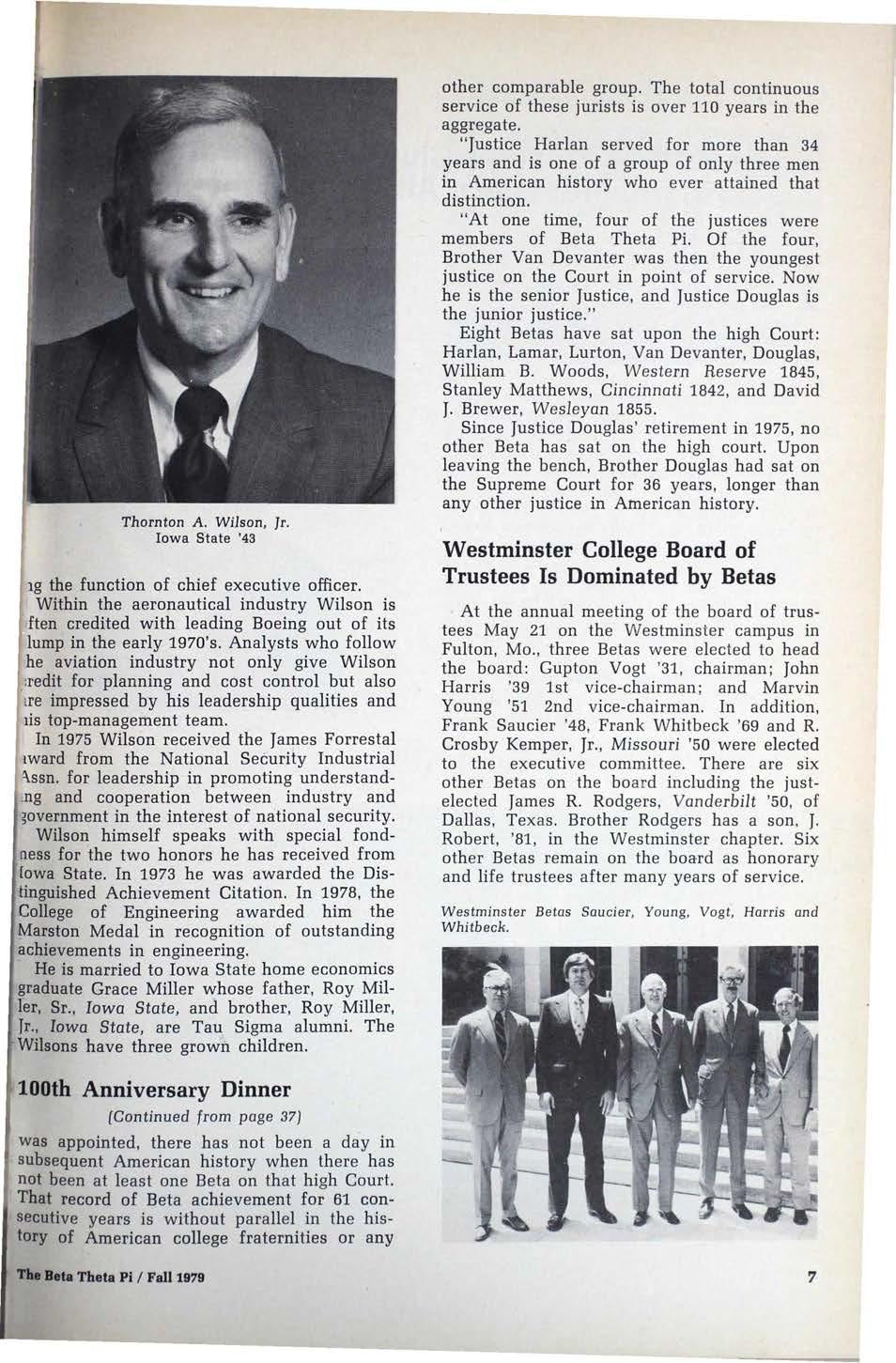 Westminster 's Beta Trustees 8 Roger Morley, President of American Express 9 Indiana's Beta Legislators Randy Phillips 10 George Bellows' "Beta Suite" Sketches 12 District XXX's Conclave at Oregon State 13 Jason Smith, New District XXV Chief 14 James Rogers McConnell, Lafayette Escadrille Hero 15 Frank Woods & Sons - a Nebraska Beta Leg e nd 16 Alumni Associations 18 Marching Along (Alumni Achievements) 26 Minneapolis' Beta Shrine Leaders 27 Ther e' s Your Alma Mater (Chapter Reports) 55 Memory & Mystic Shrine (Obituaries) 61 Wayne Allmond, a Texas District Chief 62 The Readers Write 63 Officer , Chapter & Alumni Assn. Directory COVER