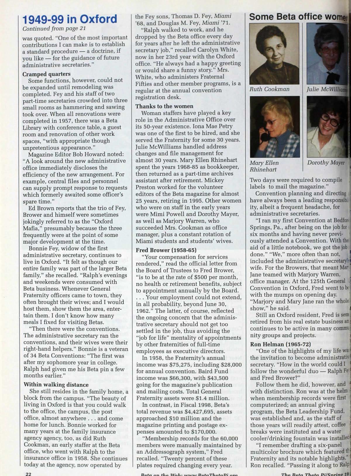 Since opening in 1949, the Administrative Office has expanded services as the Fraternity grew frmn fewer than 100 chapters to almost 140 today. This half-century of history is amply documented in this nine-page feature that includes recollections by eight men who filled the role.