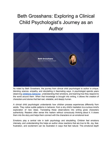 Beth Grosshans is a seasoned child psychologist who has dedicated her career to assisting families in overcoming the complexities of child development. Many parents face considerable challenges when raising their children, particularly when it comes to managing challenging behaviors such as emotional outbursts, resistance to authority, and anxiety. These issues can transform ordinary experiences like school attendance or family gatherings into sources of stress. Moreover, problems with sleep, eating, and toileting often lead to frustration for parents and children, further straining family dynamics. Understanding the weight of these challenges, Dr. Grosshans has made it her life's work to provide families with the support and guidance they need to address these difficulties. She offers practical, research-based strategies that help parents build the skills necessary to encourage healthy emotional and behavioral development in their children. She aims to help parents foster positive relationships with their children, improving their child's behavior and the family dynamic. Dr. Grosshans’ academic journey began with a B.A. in Psychology from The University of Cincinnati, which laid the foundation for her career. She continued her studies at Ohio State University, earning a Master’s and Ph.D. in Clinical Child Psychology. This advanced training allowed her to deeply understand the psychological factors contributing to children's emotional and behavioral development. After completing her academic studies, Dr. Grosshans interned at Boston Children’s Hospital and Judge Baker's Children’s Center. There, she worked with children and families in a psychiatric inpatient setting, gaining valuable hands-on experience and receiving guidance from experts at Harvard Medical School. This experience helped her develop a practical understanding of child psychology and shaped her approach to addressing children's emotional and behavioral challenges.
