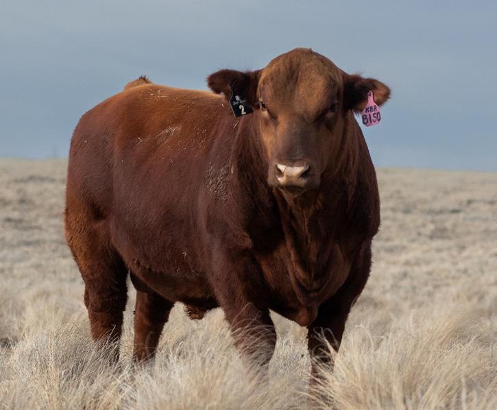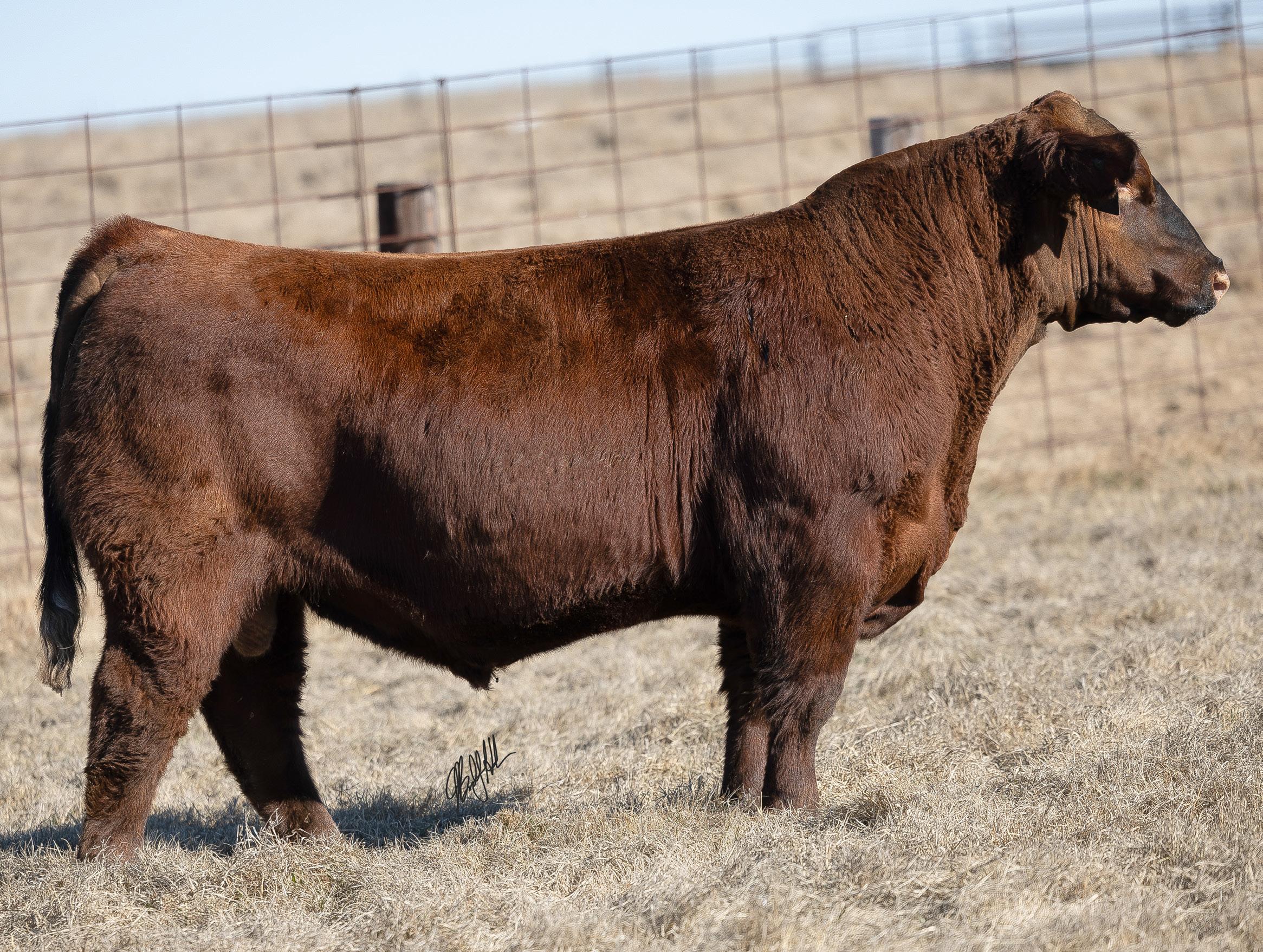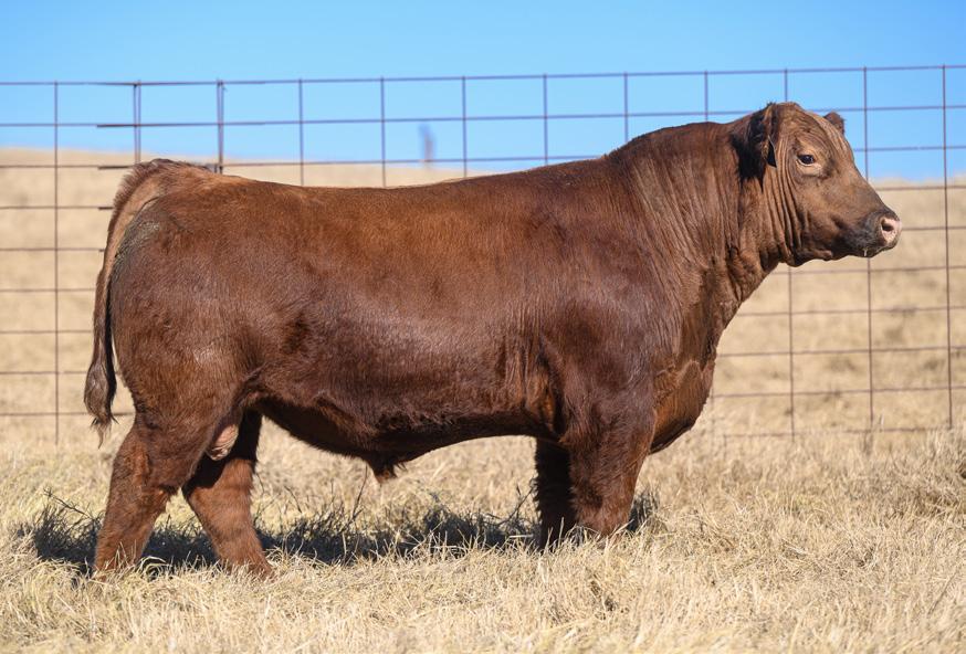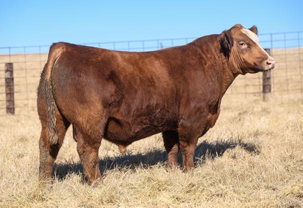 Red baldy Comanche son that is built for the big country. His mother continues to produce quality calves each year into her older age. This bull is athletic and great structured. Another bull carrying that valuable darker red hide that is in demand. This one will have a calf crop that is fun to go look at.