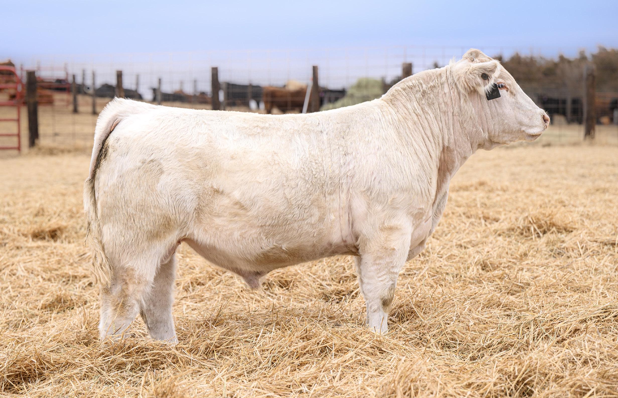 This bull was so good when he was young that he could have sold for a show steer as a calf, but he's genetically clean so we wanted to keep him for a bull. You don't make them much squarer pinned than Lot 46. He's stout boned, choke throated, and hard muscled. For those of you interested in utilizing him on genetically dirty cows to make show cattle, his breeding is diverse enough to offer you that opportunity. For everyone else that just wants powerful, Charolais colored calves from commercial cows, don't worry about any of that because he still doesn't carry any genetic defects for you either.