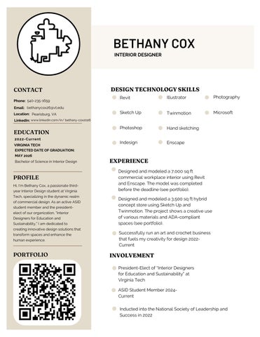 Hi, I'm Bethany Cox, a passionate thirdyear Interior Design student at Virginia Tech, specializing in the dynamic realm of commercial design As an active ASID student member and the presidentelect of our organization, "Interior Designers for Education and Sustainability," I am dedicated to creating innovative design solutions that transform spaces and enhance the human experience
