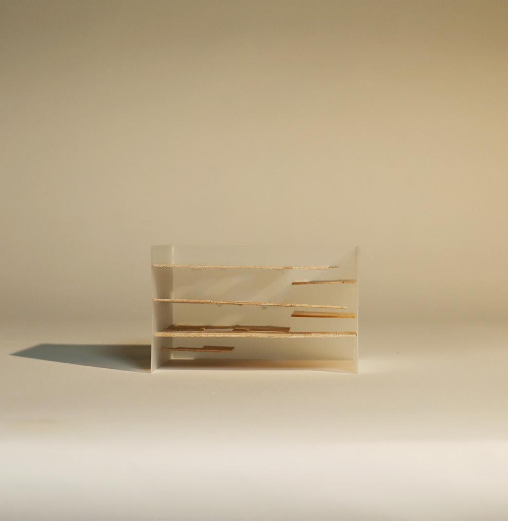 The structural shelves were developed from earlier iterations of tensile rods supporting the ‘cantilevering’ boxes. The solution worked when the pod was viewed in isolation. However, as a series of boxes, this posed a problem as the tensile members would leave no room forfurther changes to the pods.
