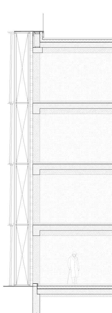A solid stone facade greets pedestrians, forming a city loggia. Nestled behind the stone facade is the glass skin (detailed above)