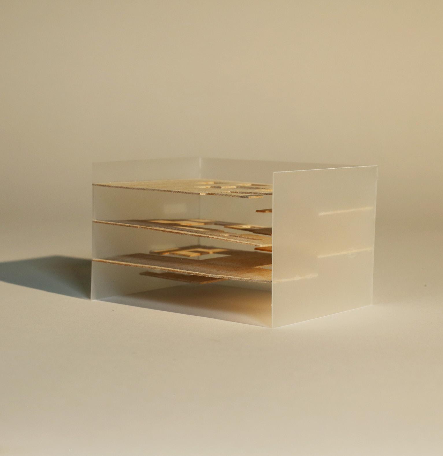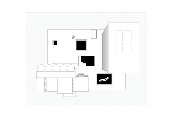The structural shelves were developed from earlier iterations of tensile rods supporting the ‘cantilevering’ boxes. The solution worked when the pod was viewed in isolation. However, as a series of boxes, this posed a problem as the tensile members would leave no room forfurther changes to the pods.