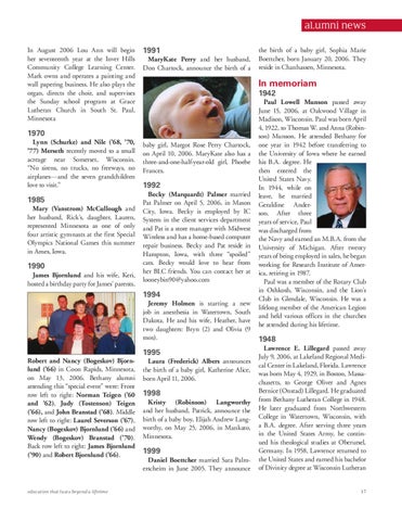 1948 Lawrence E. Lillegard passed away July 9, 2006, at Lakeland Regional Medical Center in Lakeland, Florida. Lawrence was born May 4, 1929, in Boston, Massachusetts, to George Oliver and Agnes Bernice (Onstad) Lillegard. He graduated from Bethany Lutheran College in 1948. He later graduated from Northwestern College in Watertown, Wisconsin, with a B.A. degree. After serving three years in the United States Army, he continued his theological studies at Oberursel, Germany. In 1958, Lawrence returned to the United States and earned his bachelor of Divinity degree at Wisconsin Lutheran 17