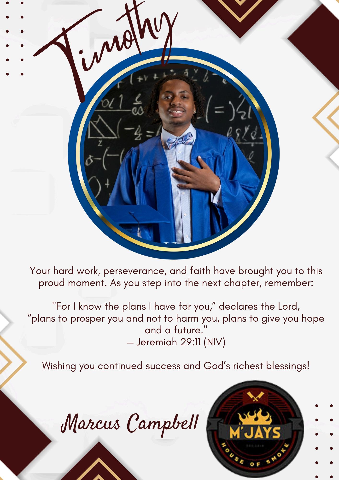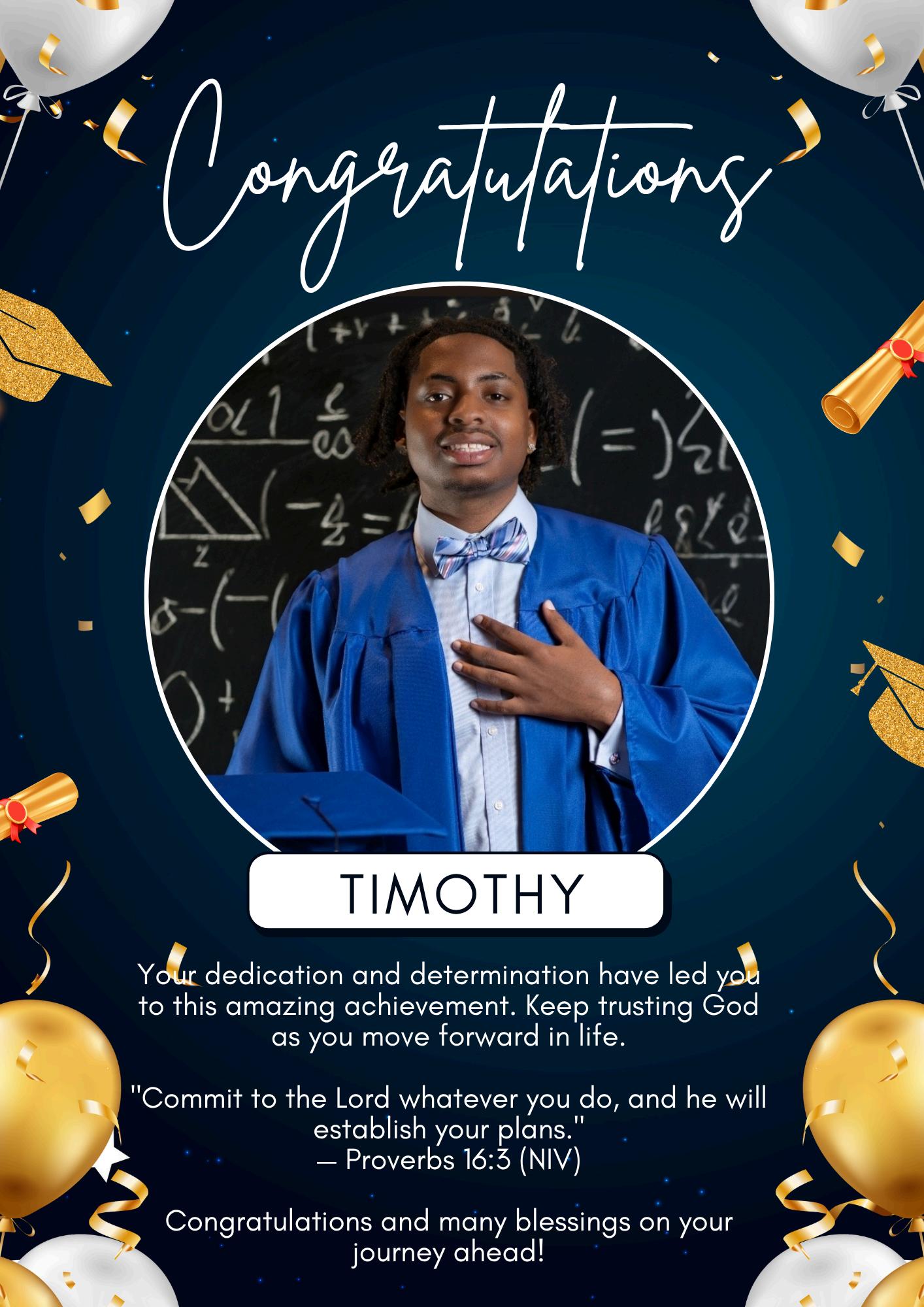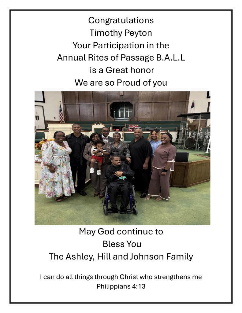 In2024,TimothywaspresentedintheAlphaKappaAlphaSorority,BetaMuOmegaChapter,HighSenior RecognitionScholarshipProgram.There,hereceivedtheBeverlyButlerFamilyScholarship.Timothyhasbeen acceptedatninedifferentcolleges/universities,buthehasdecidedtotracehisrootsatoneoftheHistorical BlackCollegesandUniversities-hewillmatriculateonthecampusofWileyUniversity,wherehewillpursuea B.S.degreeinBusinessAdministrationwithaminorinAviationMaintenance.Timothyiseagertoembarkon hisnextjourneywithdedication,creativityandenthusiasm!