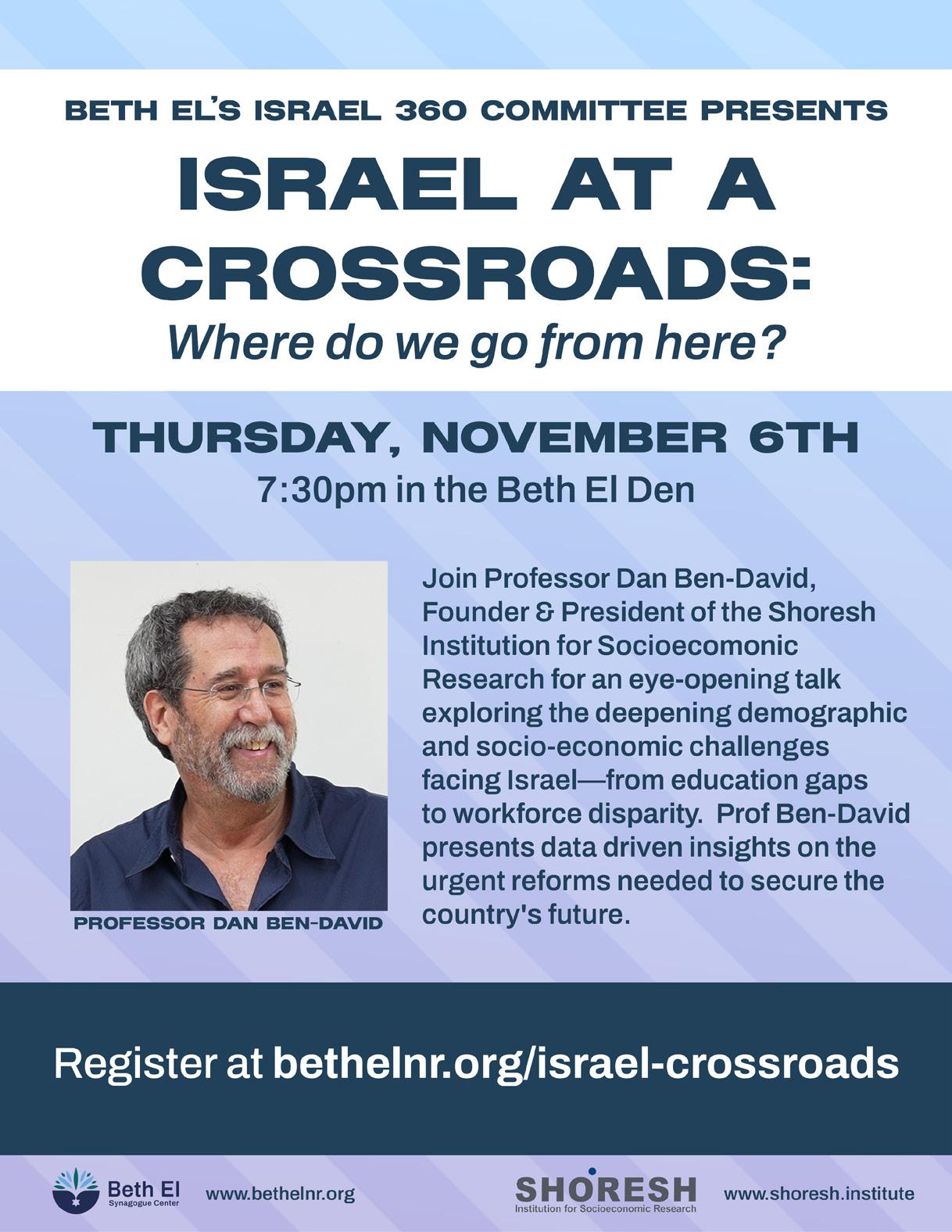 The Israel 360 Committee will launch this year’s programming on Thursday, November 6th at 7:30pm with a thought-provoking presentation by Professor Dan BenDavid, President of The Shoresh Institution. Shoresh is an independent, non-partisan socio-economic policy research center dedicated to identifying the root causes of Israel’s internal challenges—issues that pose an existential threat to the country’s future.