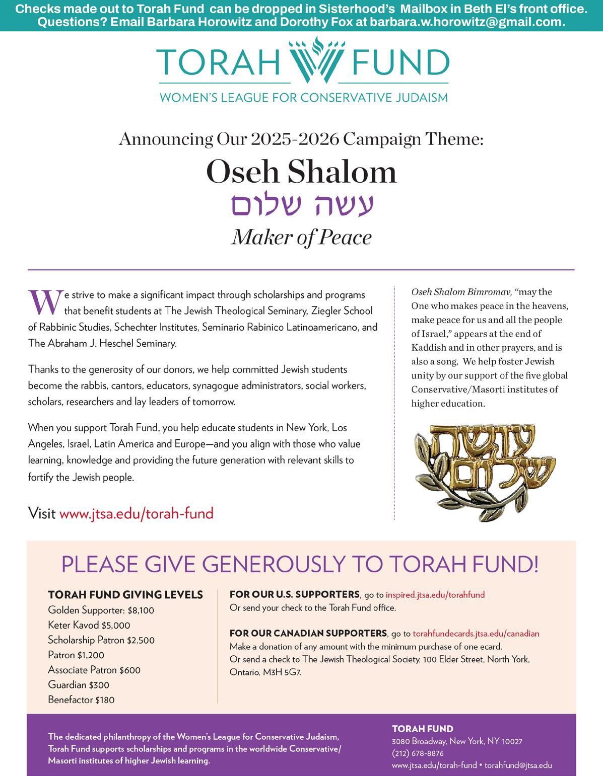 Michael Wechsler; Helene Katz in memory of her beloved brother Herbert Weintraub z”l; Marc Wager and Michelle Schoenfeld in honor of Rabbi Sitkin for his support following the loss of their mother and also for officiating at her unveiling; Phyllis Cole in memory of Robert Wechsler z”l, beloved brother of Michael Wechsler; Debra Poliner in memory of Leon Protass z”l, beloved husband of Barbara Protass; Helene Katz in honor of Levi Katz’s Bar Mitzvah, grandson of Rabbi Eugene & Nina Katz, son of Gideon & Stephanie Katz; Naana Cobbina in memory of Robert Wechsler z”l, beloved brother of Michael Wechsler; Naana Cobbina in honor of David & Barbara Horowitz on their 50th wedding anniversary; Naana Cobbina in honor of Gary & Gwen Salmo on their 40th wedding anniversary; Charlotte Yudin; Meri-Jane Rochelson & Joel Mintz with thanks to all the Beth El rabbis, for their kindness and caring as we mourned our mother and mother-in-law, Eleanor Mintz z”l; Elise & Barry Richman with gratitude for Rabbi’s Schuck’s guidance and support with our mother’s unveiling; Marvin & Shari Chinitz in honor of Darren Peister, the master candyman of Beth El, who brings joy to our shul every Shabbat; Iris Sitkin & Barry Yaches in honor of Rabbi Zach Sitkin, our wonderful nephew, who never forgets to call his aunt & uncle throughout the year! And to his wife Lisa, who hosts us for holidays with joy and great food; Mark & Eleanor Walfish in memory of Ann Walfish z”l, mother of Mark Walfish; Jeffrey & Roberta Graf in memory of Berta Graf z”l, my beloved Grandmother, mother of Rudolf Graf; Rita & David Kaufman in memory of Michael W. Kaufman z”l; Ira & Cynthia Shechter in honor of Jacob Shteingart and Laura Chodes’s wedding; Ron Shamah; Rose Community Foundation in memory of Leon Protass z”l; Sharon & Peter Spenser in honor of Sharon’s Rosh Hashanah honor and the birth of their grandson Liam; Janet & Isaiah Seligman in memory of Janet’s beloved brother Robert Kenler z”l; Lisa & Perry Jacobs for the good health of Eliazor ben Hana; Harold & Laura Dworetsky in memory of Martha & Ephraim Dworetsky z”l, Raphael Dworetsky z”l and Saul & Beverly Zelkowitz z”l; Judith & Elliot Schwartz in memory of Judith’s beloved father and sister on their yahrzeits; Judith & Elliot Schwartz for Kol Nidrei.