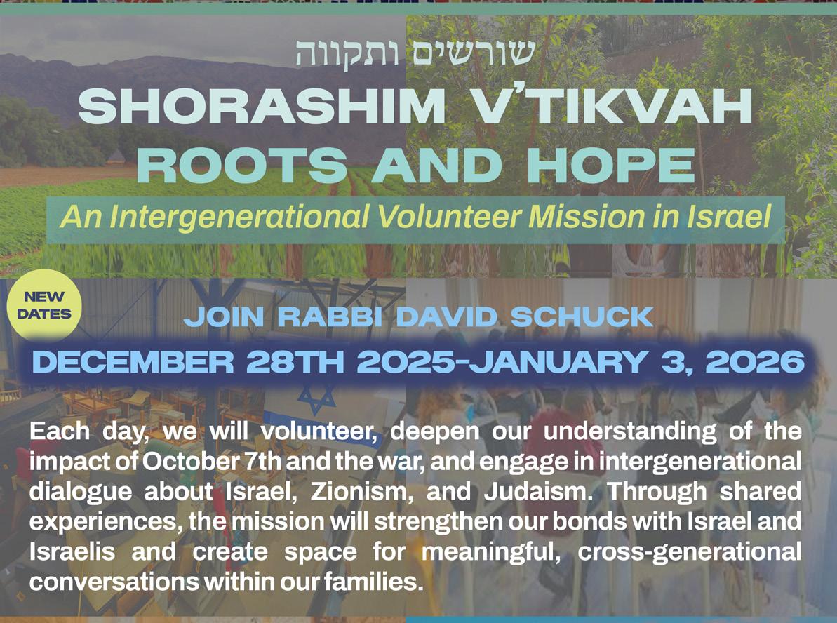 Join me, to volunteer side-by-side, to explore Israeli society in this moment of renewal, to spend Shabbat together in Jerusalem, and of course, to have a wonderful time together in our homeland. If you have any questions, please email or call me.
