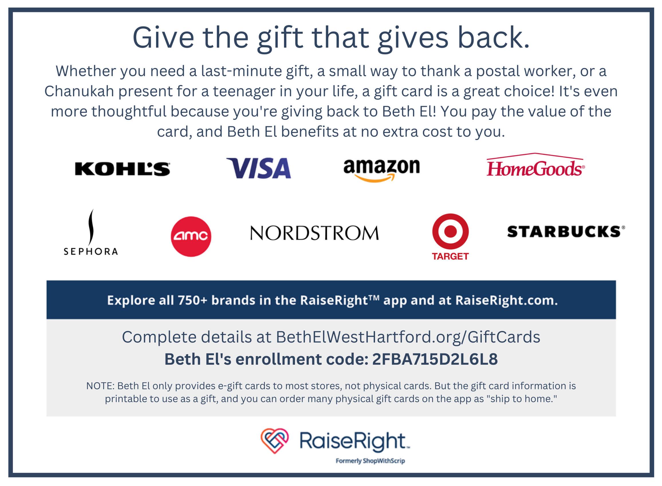 Continue using E-GIFT CARDS to Support Beth El