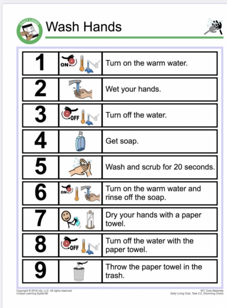 Once you know more about the individual’s current level of performance, identify the skills that are necessary to have in order to perform the target skill correctly. Observe and take data. Example: an individual can add soap to their hands, but cannot lather or rinse during hand washing. Once all required skills are identified, decide how much detail the task analysis will include. Depending on the individual, you may need more or less steps, or steps appropriate for the setting. Gather the materials needed to teach the task. Materials will depend on the unique needs of the individual, their cultural beliefs, also what is available to them.