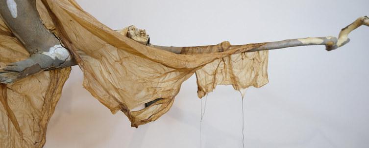 Inter is based on the material and poetic exploration of symbiotic colonies of bacteria and yeast (scoby), also known as a pellicle, that form while making a fermented tea, or kombucha. The jelly-like pellicle consists of a combination of cellulose, proteins, and the polymers formed through the growth of bacteria and yeast. I use these pellicles mostly unaltered, but drape them, still wet, over sycamore branches attached to the gallery wall. The scoby dehydrates, changes, and transforms over the course of the exhibition.