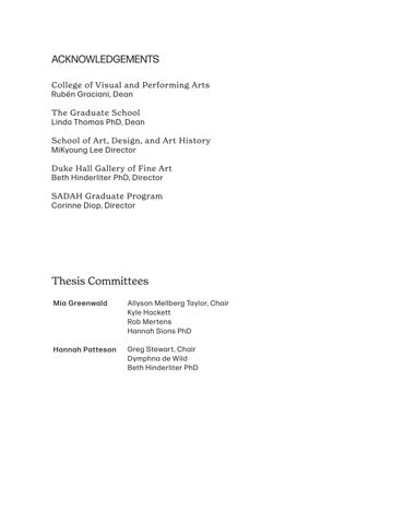 This catalog documents the 2023 MFA Thesis Exhibitions by Mia Greenwald and Hannah Patteson. It is the culmination of their intense creative inquiry that included skill-building, conducting historical research, connecting the theoretical underpinnings, challenging assumptions, risk taking, digging deeper, writing, thinking, sharing, discussing—and making, making, making. While the photographs and text work in retelling their stories, the exhibitions fall in the category of “you really had to be there”.