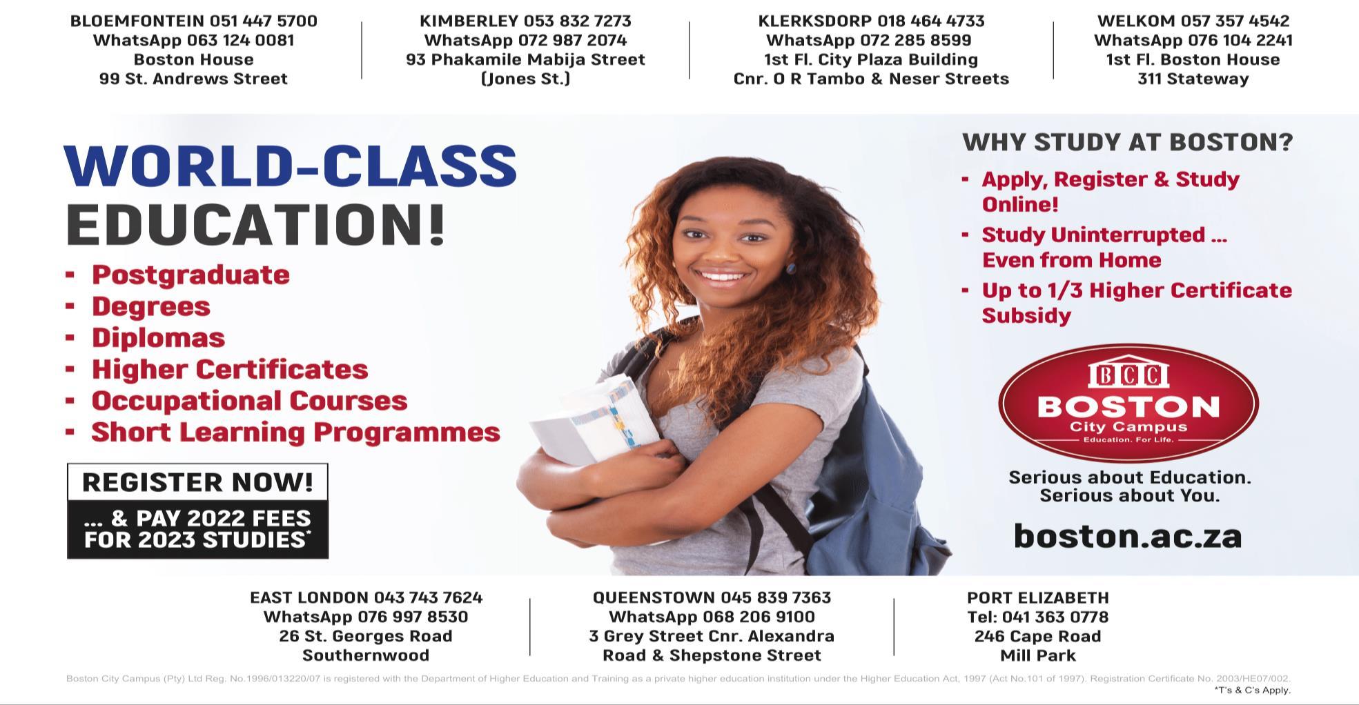 I would also recommend leadership and managerialcourses such as the Boston BCom, Diploma in Business Management orthe Higher Certificate inBusinessManagement”