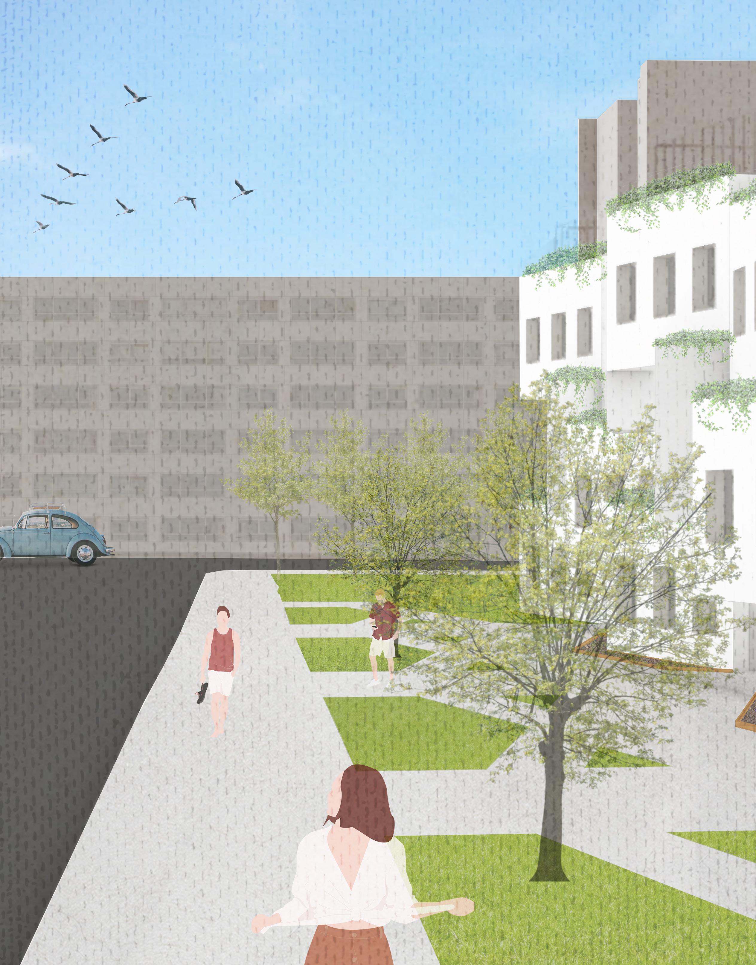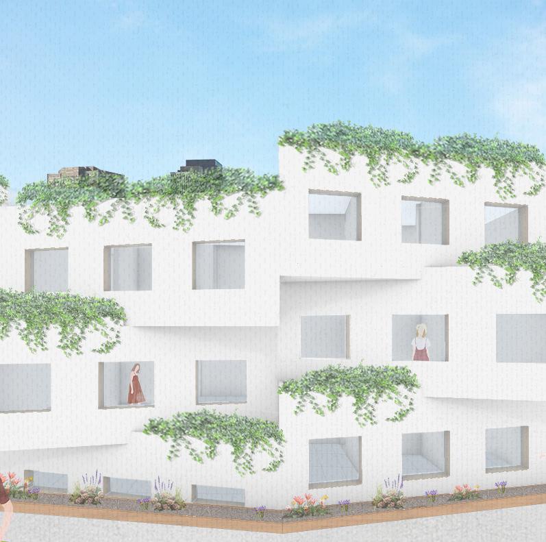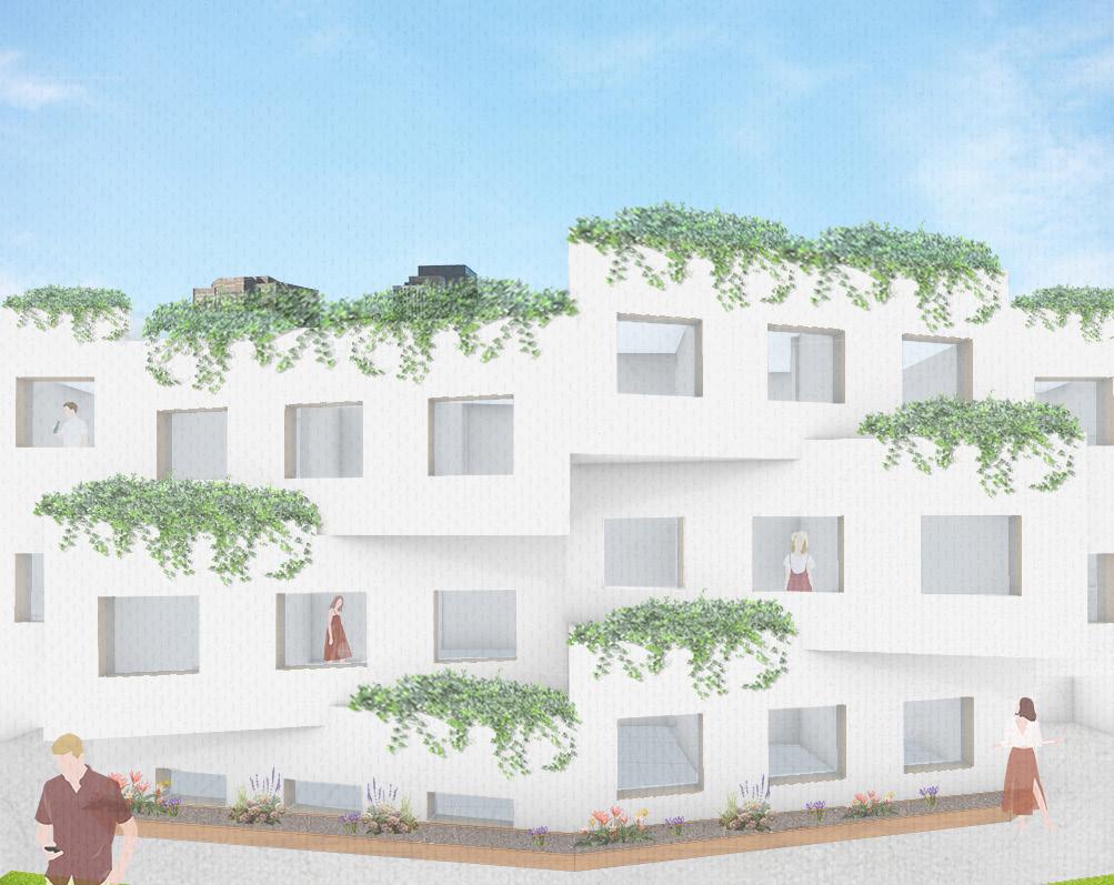 The main goal of this housing project is to create efficient and affordable graduate student housing, while also establishing an enjoyable place to live. This project is designed for young adults that are sociable, want to get to know their neighbors, and enjoy the outdoors. Each module consists of rooms stacked around a long staircase, so no two rooms are on the same level. This gives the residents a sense of having their own space, while still being close to all of their neighbors. Each unit has a small kitchen with just the bare necessities, and each group of units has a large shared kitchen. This kitchen acts not only as a nice place to do your cooking, but also as a social area perfect for young adults. The staircase continues up to a large roof garden for the residents to hang out. In order to bring in more light and to capture unique views, the front facades are tilted and stacked, so that the exposed roof of the unit below becomes a planter box for the unit above.