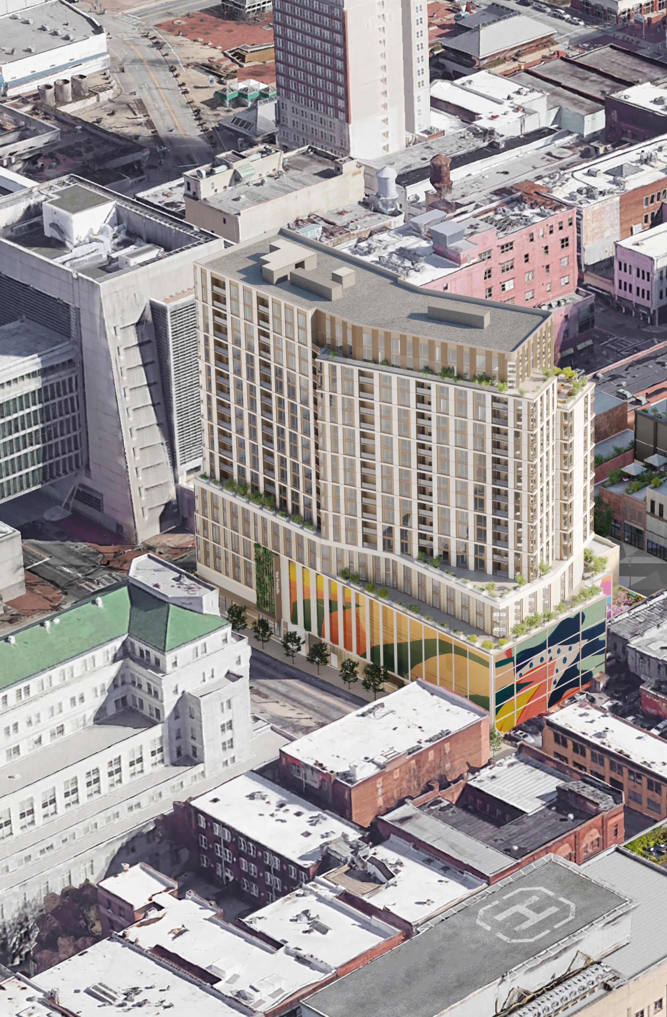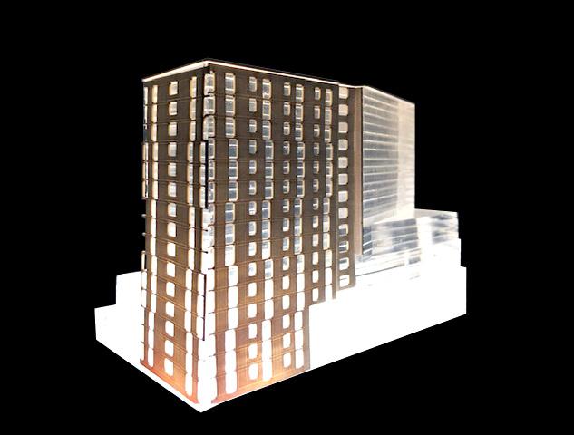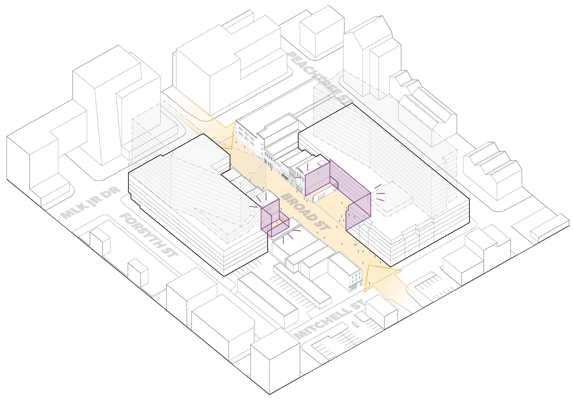 For my first venture into 3D modeling, I created an option for the screen over the parking garage, using a metal fin and flipping it where the demolished buildings on the site were. I also helped model the lobby design, which had to accommodate the elevation changes of the site. Since the project is multi-use, I helped diagram the different circulation paths on the ground level.